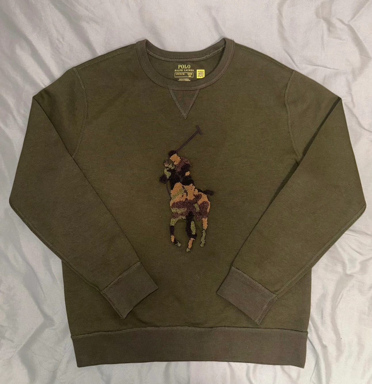 New green Polo Ralph Lauren sweatshirt with a green and brown embroidered logo. Kid's size L, Women's small
