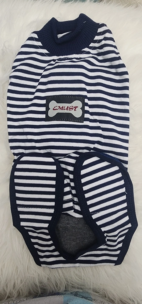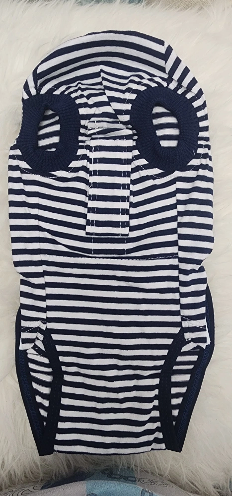 Blue and white striped dog recovery suit, with a velcro closure that can be rolled up for bathroom breaks.
