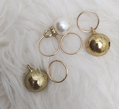 Four gold bells with an attached faux pearl charm on a gold ring. The bells are about 1 cm in diameter. The faux pearl is about 1 cm in diameter.