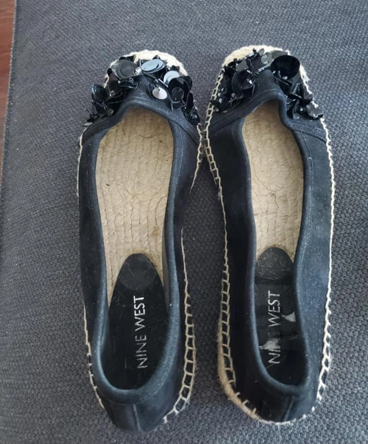Black espadrilles with sequin embellishment. Worn once out of the house. I keep trying to wear them but my foot is to wide. So I never get out of the house with them. Size 7