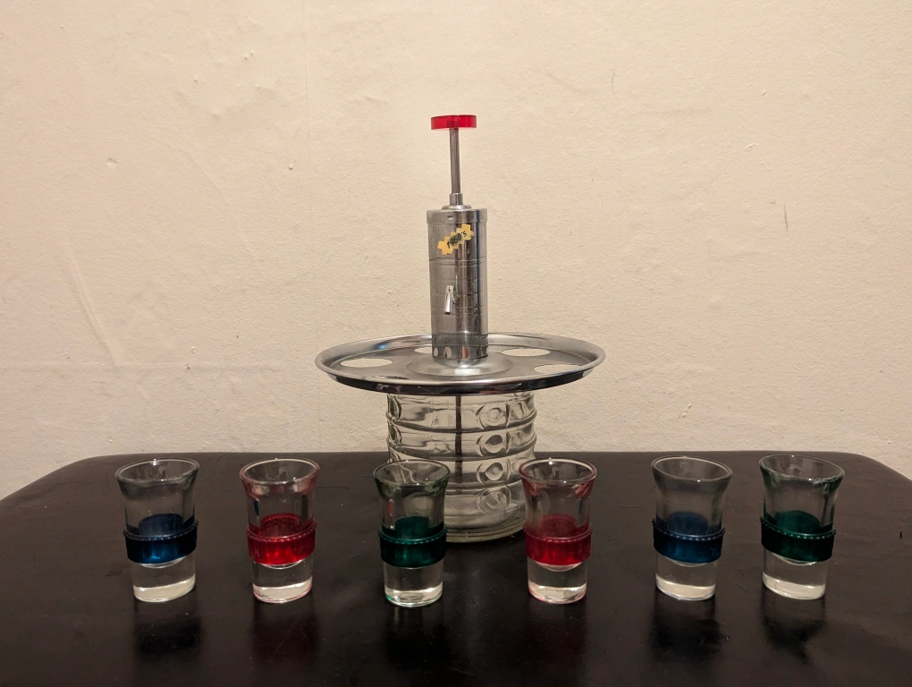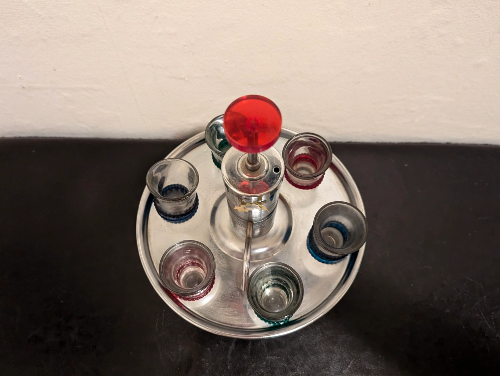 This set includes a liquor dispenser with six shot glasses. The set has a chrome base and a glass bottle. The shot glasses have coloured bands. From the 1950's.