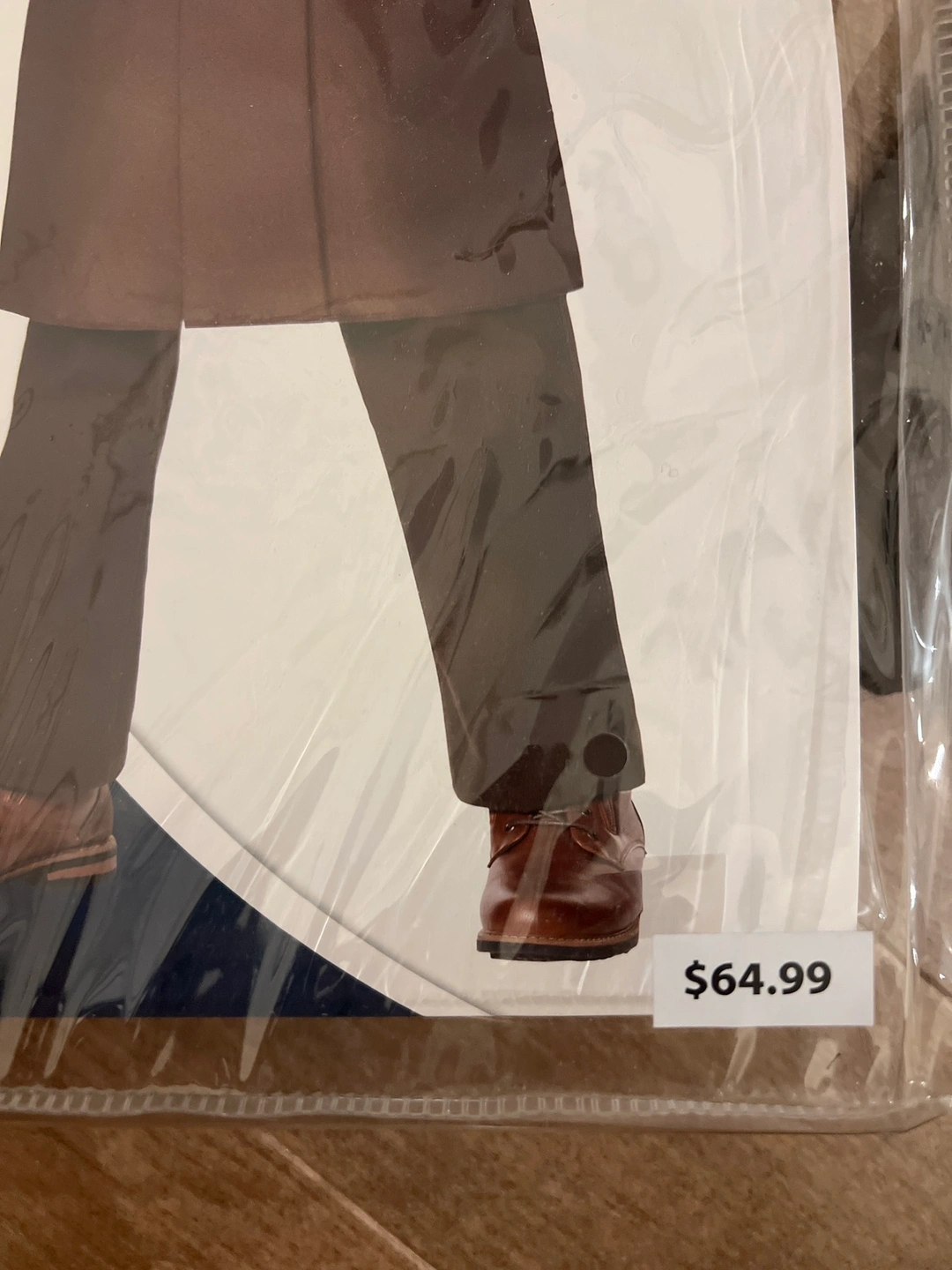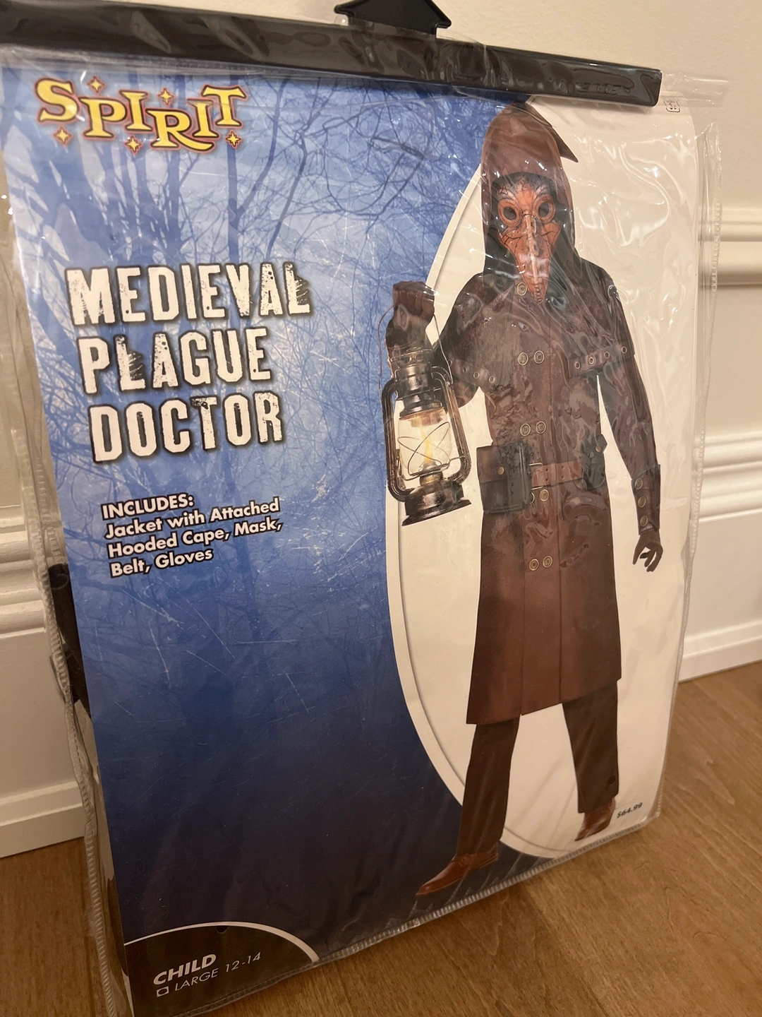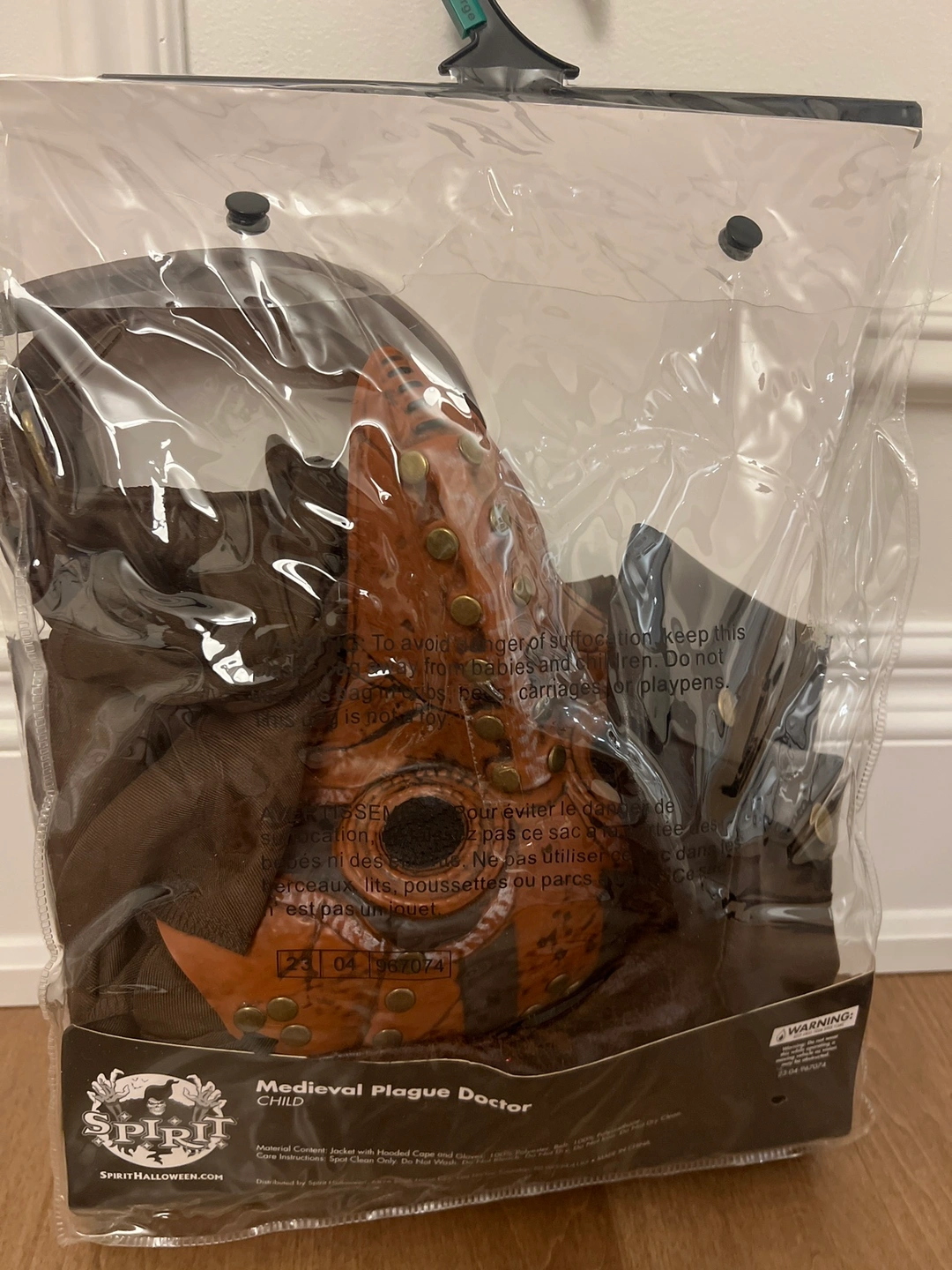 This is a Spirit Halloween Costume in size Large for children ages 12-14. It includes a jacket, hooded cape, mask, belt and gloves. Complete set, worn once, like new. Paid $64 plus tax brand new last year.
