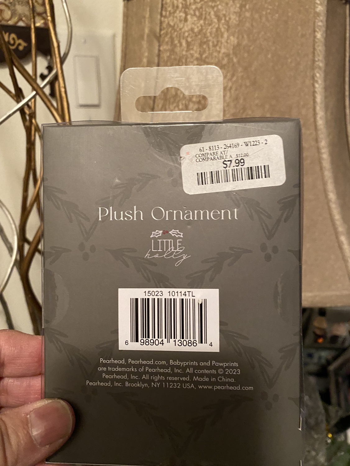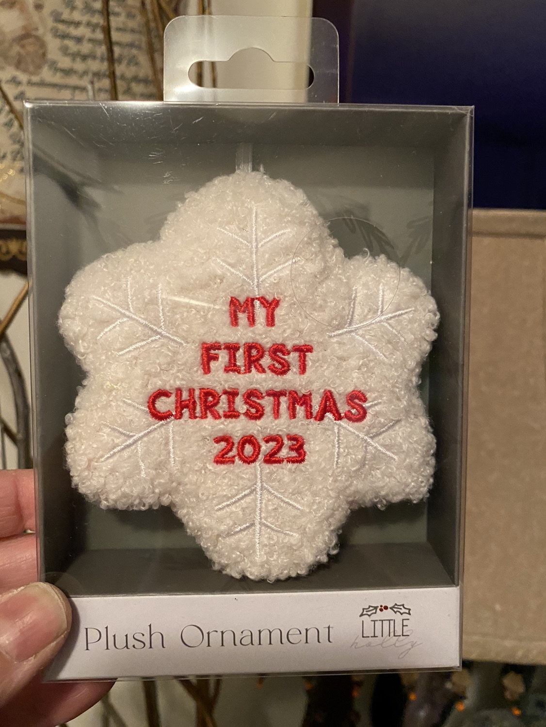 White snowflake ornament with the words "My First Christmas 2023" in red embroidery. The ornament is from Little Holly and is plush. Comes in a clear plastic package.