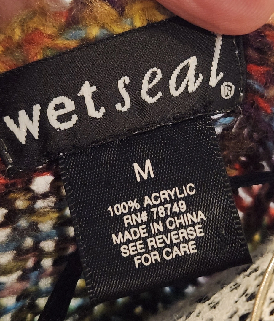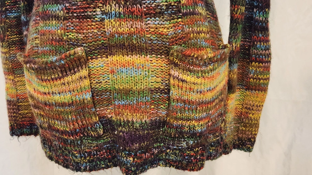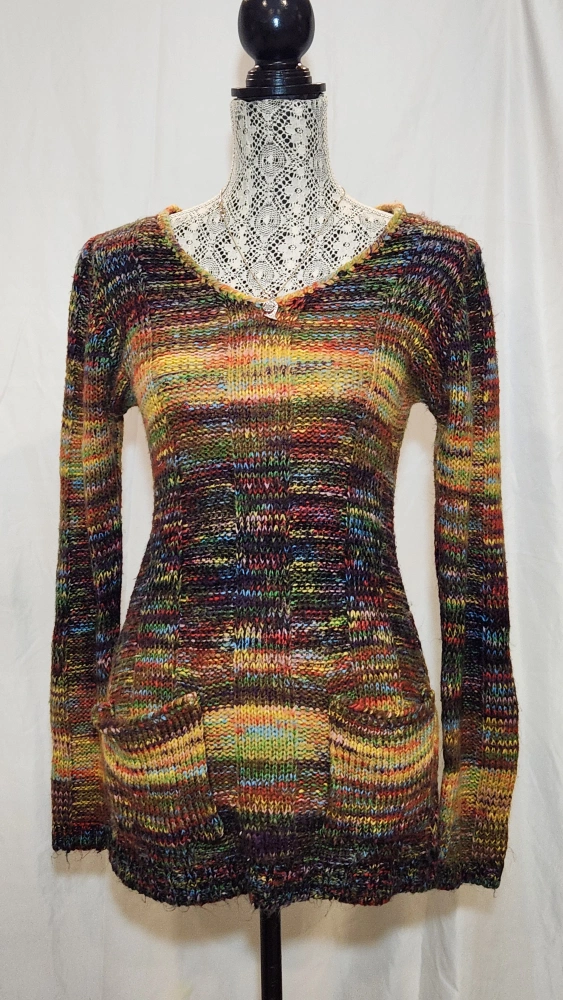 A long-sleeved multicoloured knitted weater in a size M with a slight deep scoop neckline and two fron pockets. It is made of 100% acrylic. Barrhaven area close to Home Depot Cash and pick up prefer can arrange delivery within Ottawa area for a fee and shipping for outside Ottawa. Pls check other listings