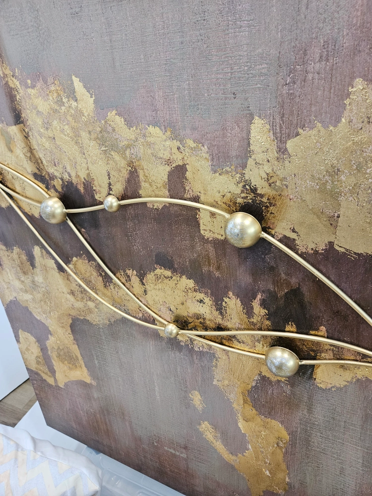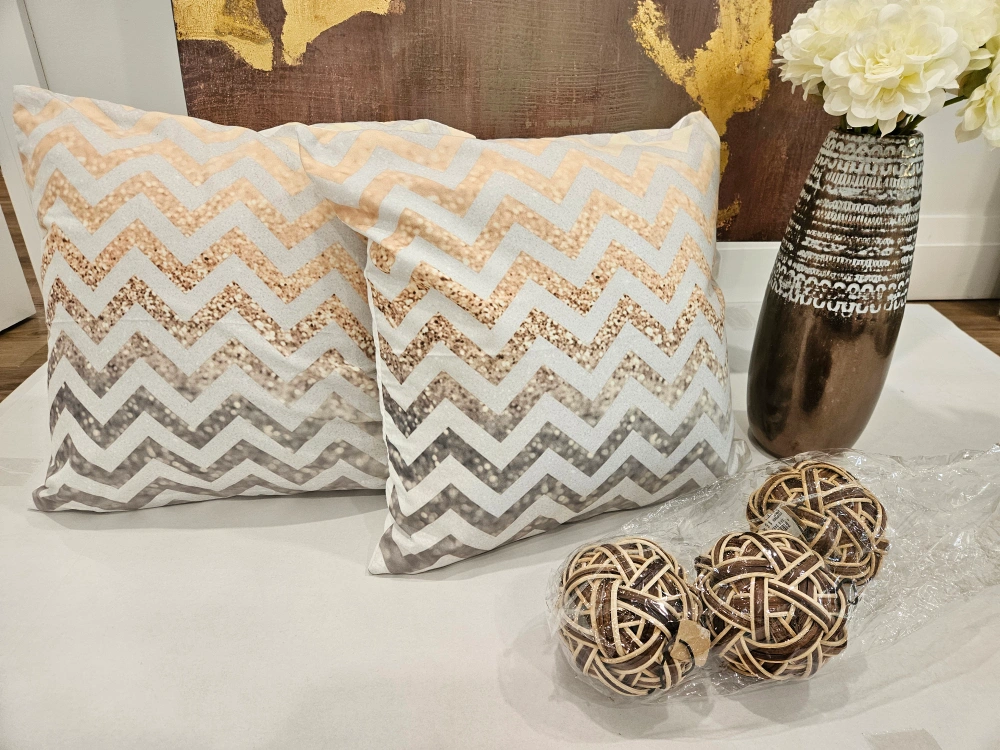 Art brown/ gold/metal accent new31.5x47 in Three decor pillows 18 x18 in One vase new 6x 13.5tall with flower Three pier1 decor balls new 5 inches Used for staging Complete set for decor any one room