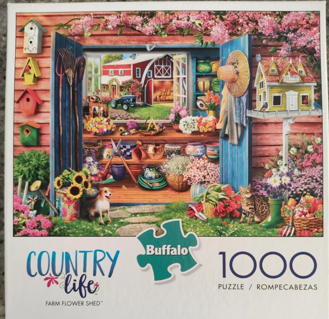 This is a 1000-piece jigsaw puzzle by Buffalo Games called "Country Life: Farm Flower Shed". The puzzle depicts a flower shed with a farm scene in the background and includes a dog and a cat. The puzzle is complete in the box. It comes with a puzzle diagram to help you put it together. It is made from 100% recycled paperboard and printed with non-toxic inks.