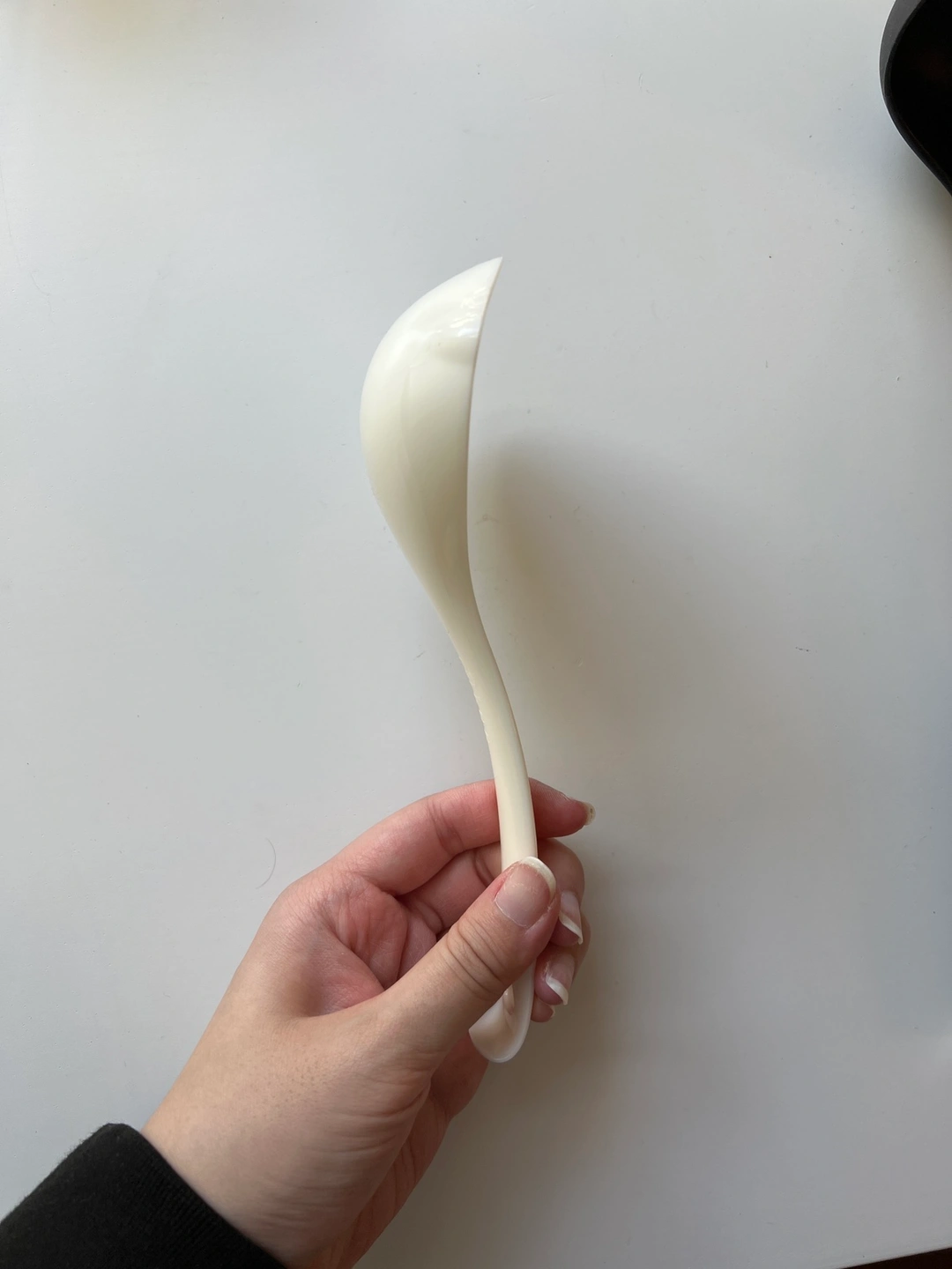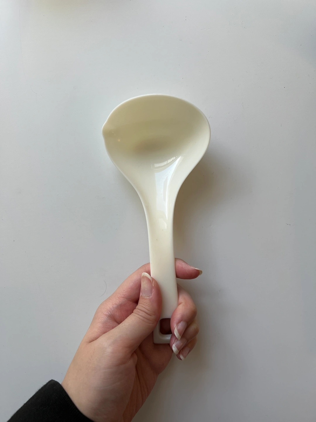 A white ladle with a curved handle. Has a little spout for easy pouring. Think it came with a rice cooker but I don’t use it.