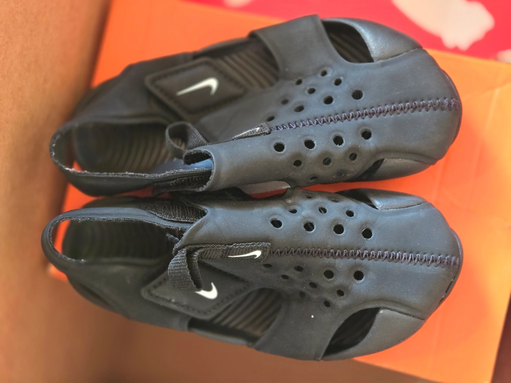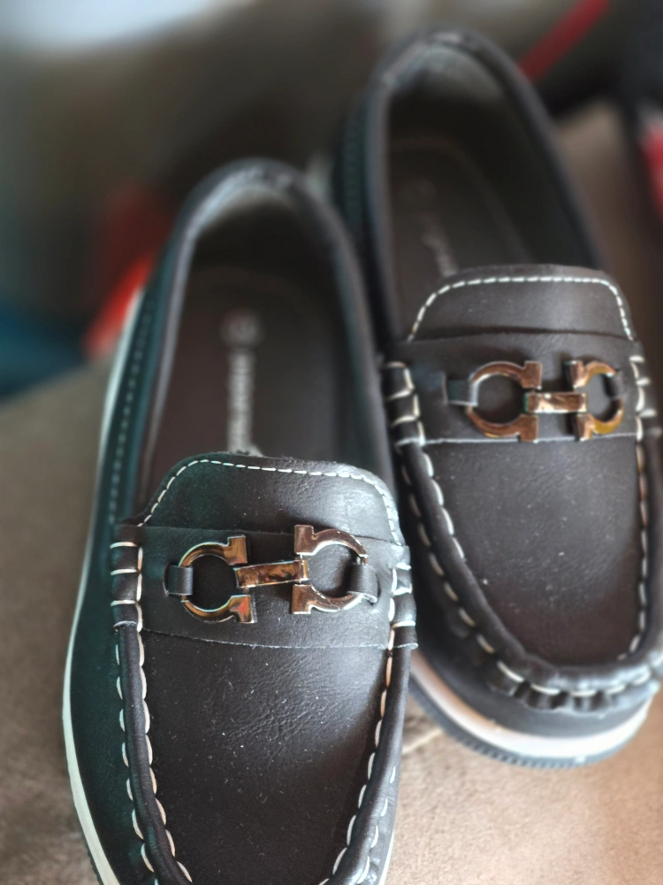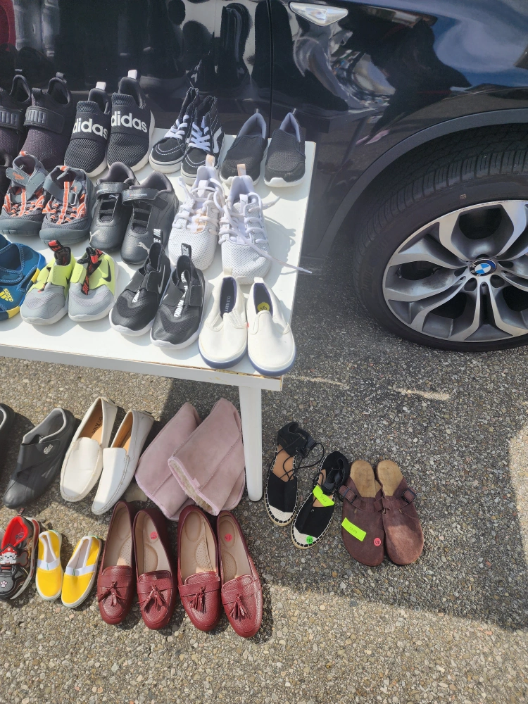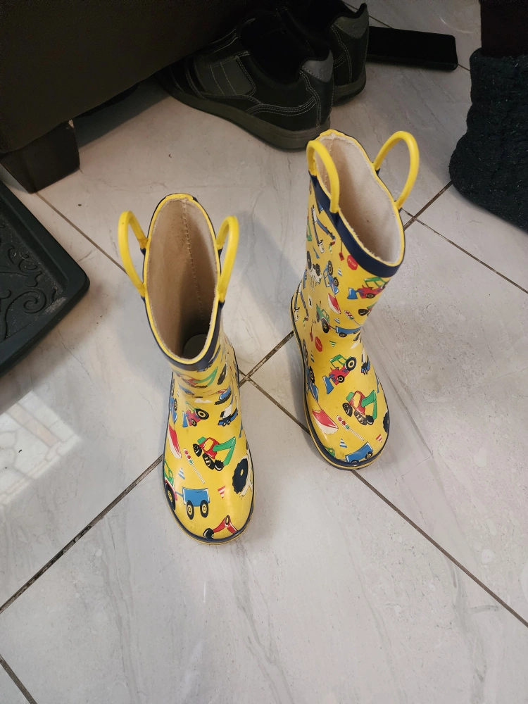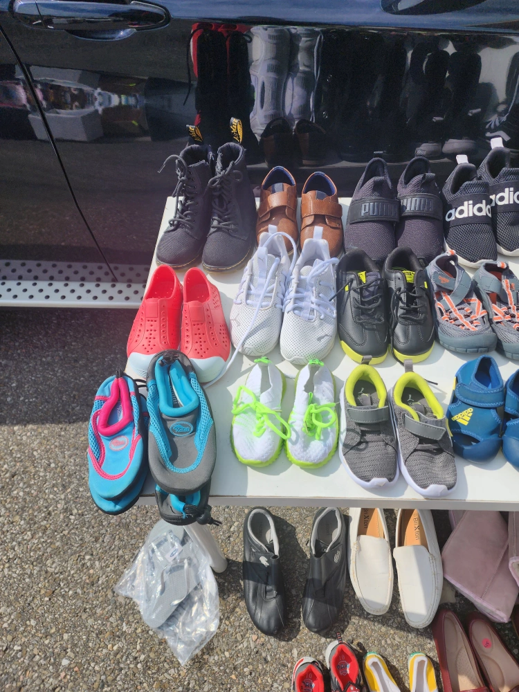 Bundle of five pairs of kids' shoes in size 10. Includes dress shoes, rain boots, soccer cleats, sandals, and athletic shoes.