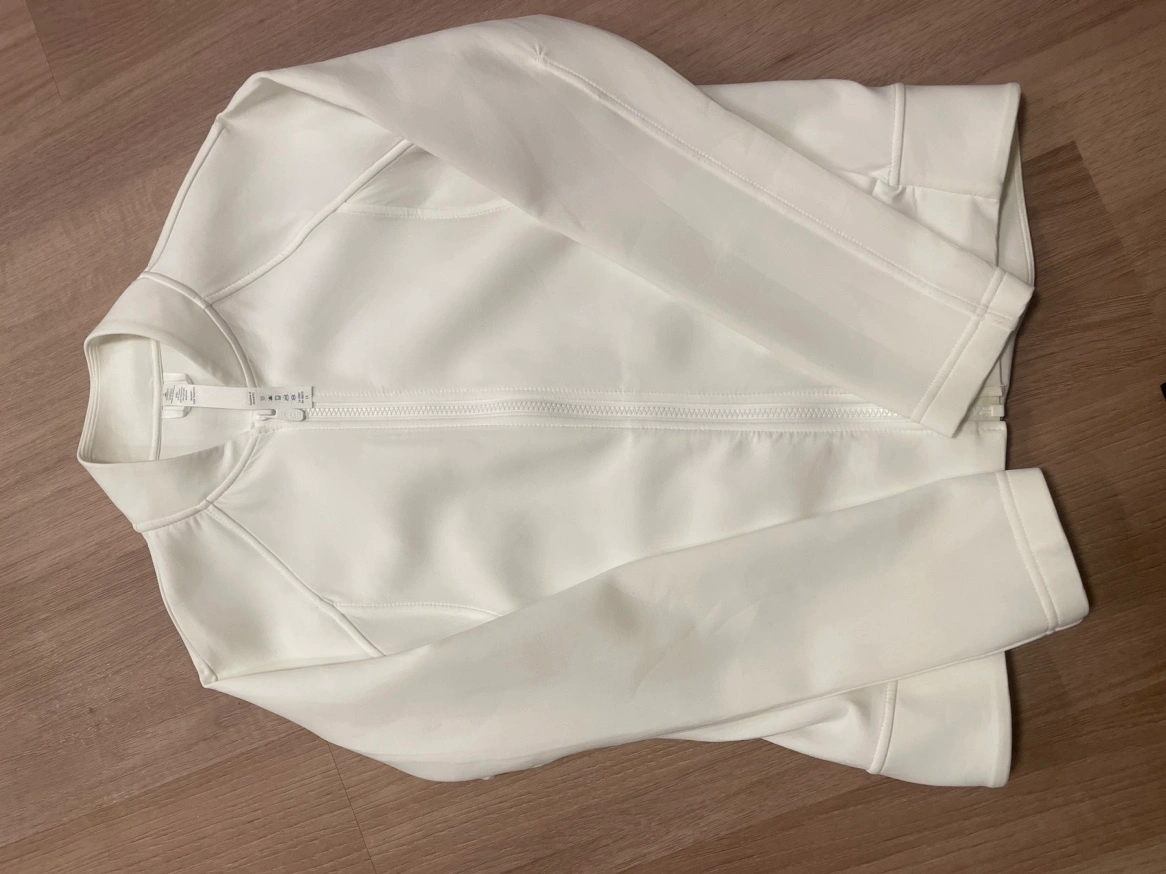 A white jacket with a zipper closure and long sleeves. Good for running or gym