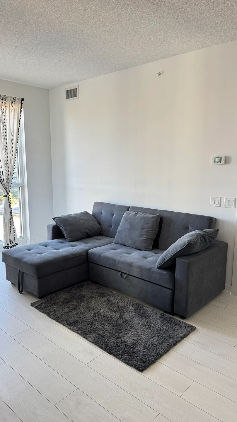 Grey-blue sectional sofa with ample built-in storage under the chaise longue. Comes with a comfy pull-out sleeper for those over-night stays of your lovely guests.
