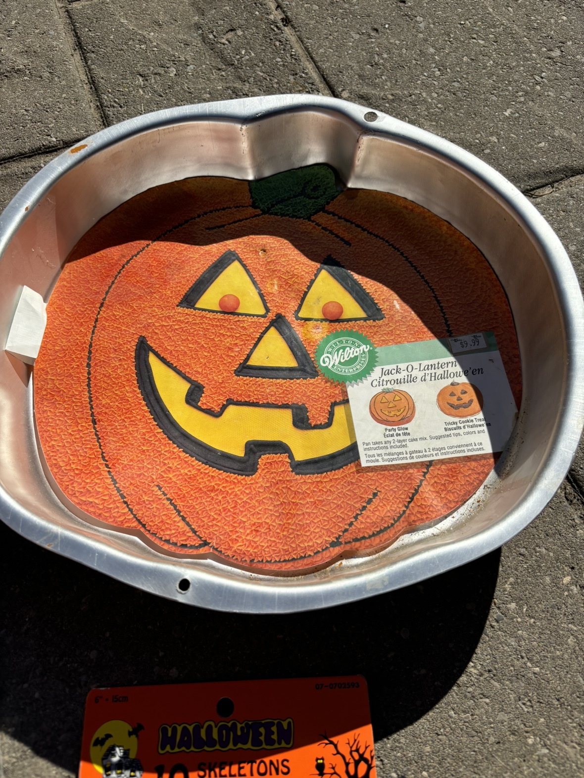 Package of 15 treat bags, 1 jack-o-lantern cake pan, 10 skeleton hanging decorations, and 6 paper luminaries.