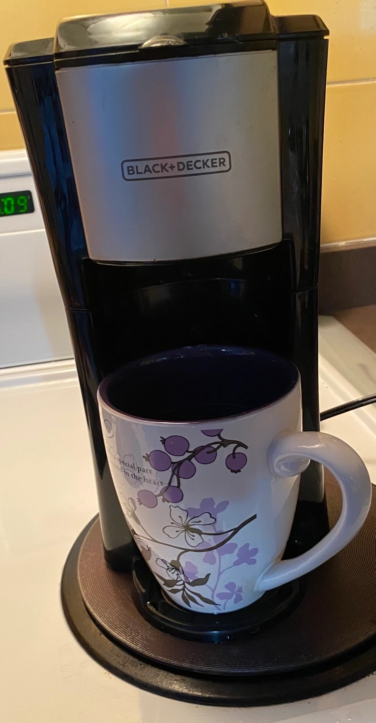 This is a single-serve coffee maker. It includes a removable water reservoir, a removable filter basket. The coffee maker is black and silver. It is used but still in good working condition. Open to offers!!