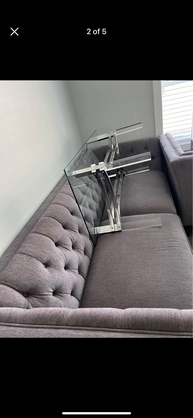 This is a beautiful and modern grey sectional sofa with a tufted back and sides. It comes with a glass and metal coffee table and side table.