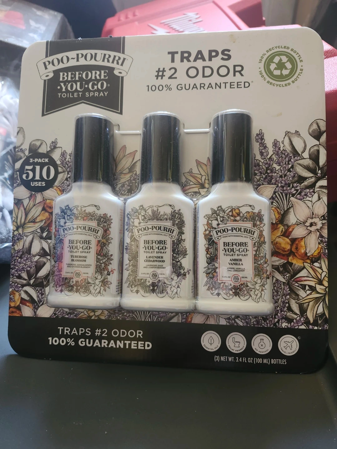This is a 3-pack of Poo-Pourri Before You Go toilet spray. Each bottle contains 3.4 FL OZ (100 ML). It traps #2 odor and is 100% guaranteed. The scents included are Tuberose Blossom, Lavender Cedarwood, and Amber Vanilla.