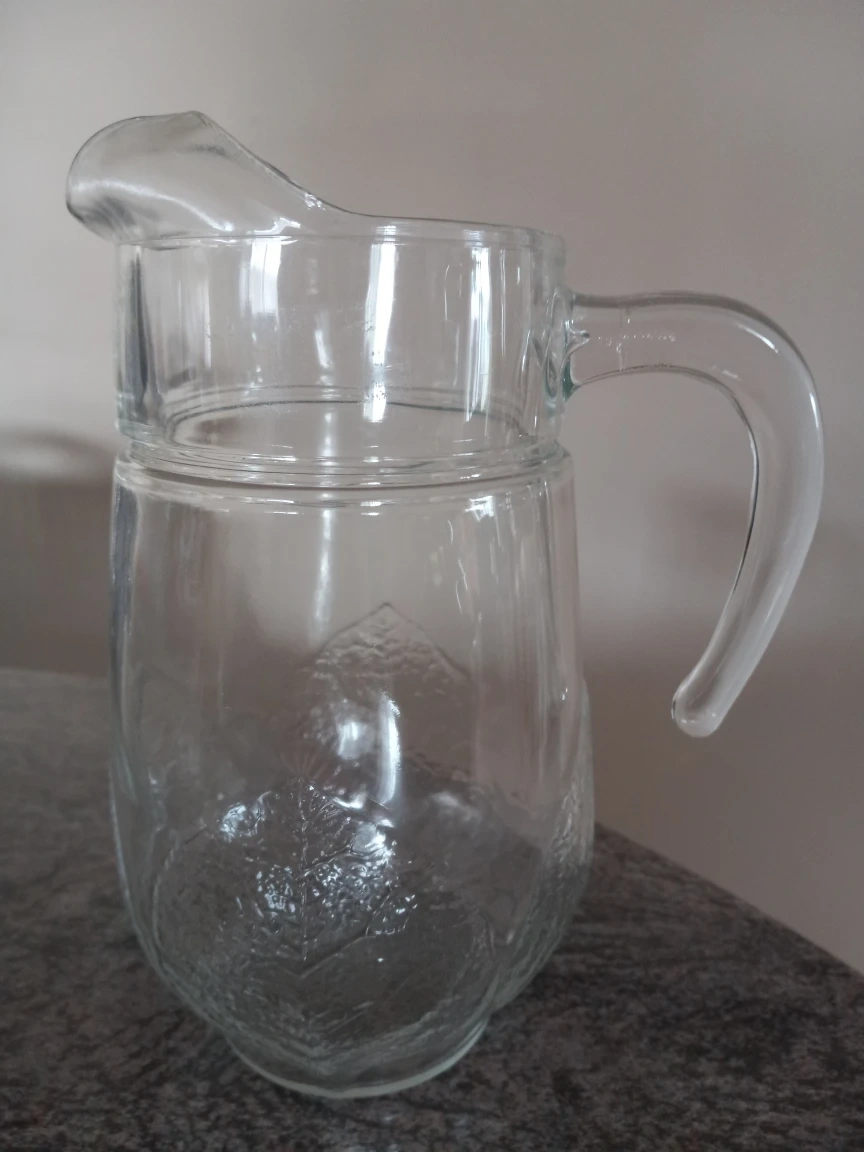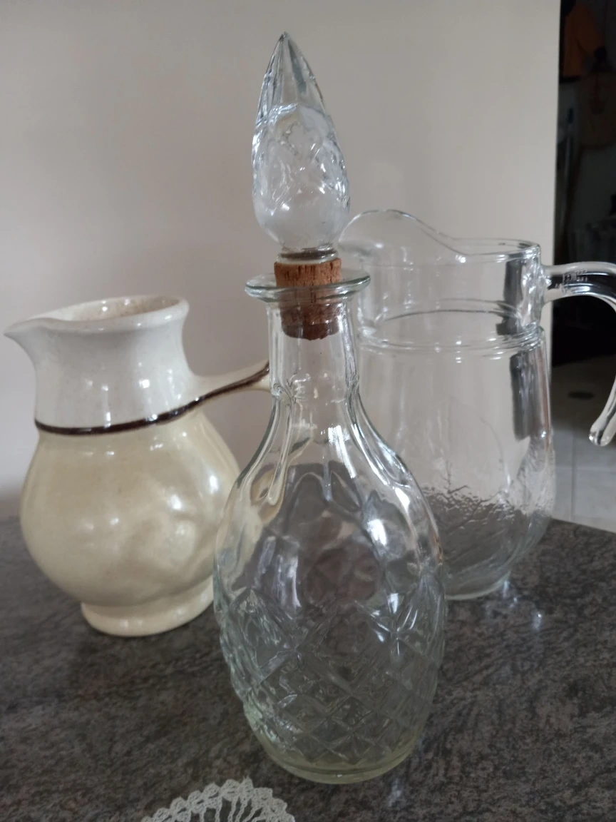 Pitchers for juice, water or wine bottle at $15 each. Glass pitcher has another matching one. Good deal if you purchase all 4.