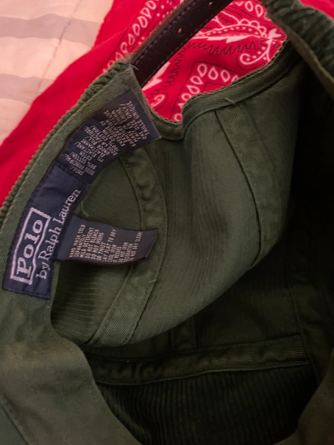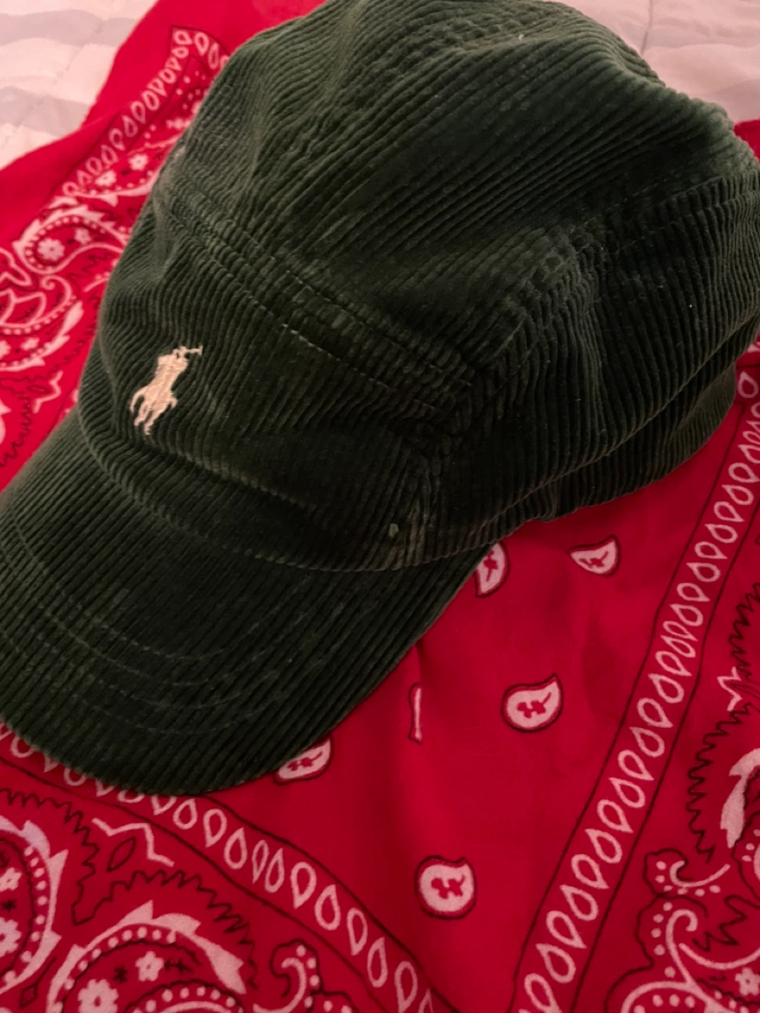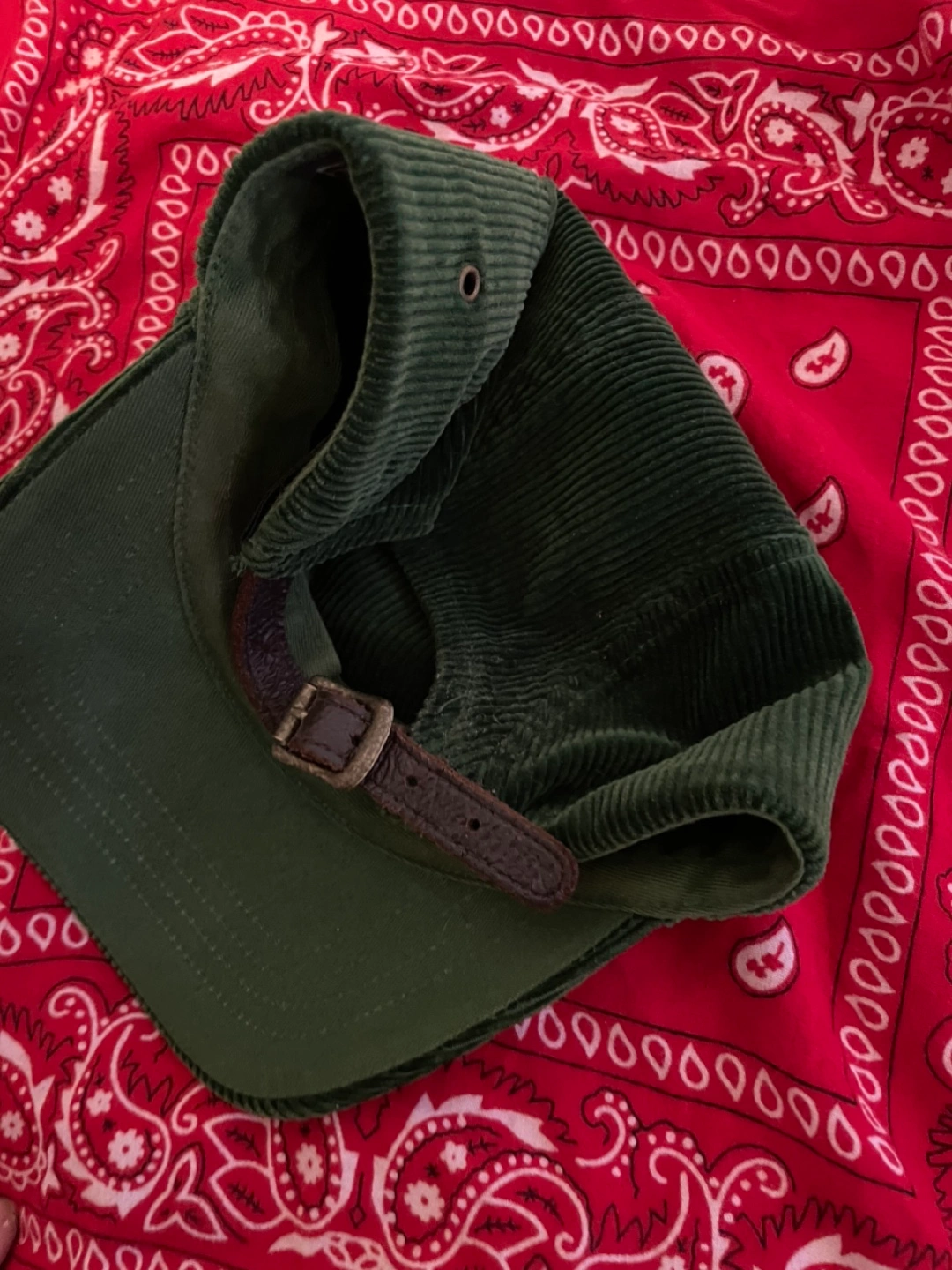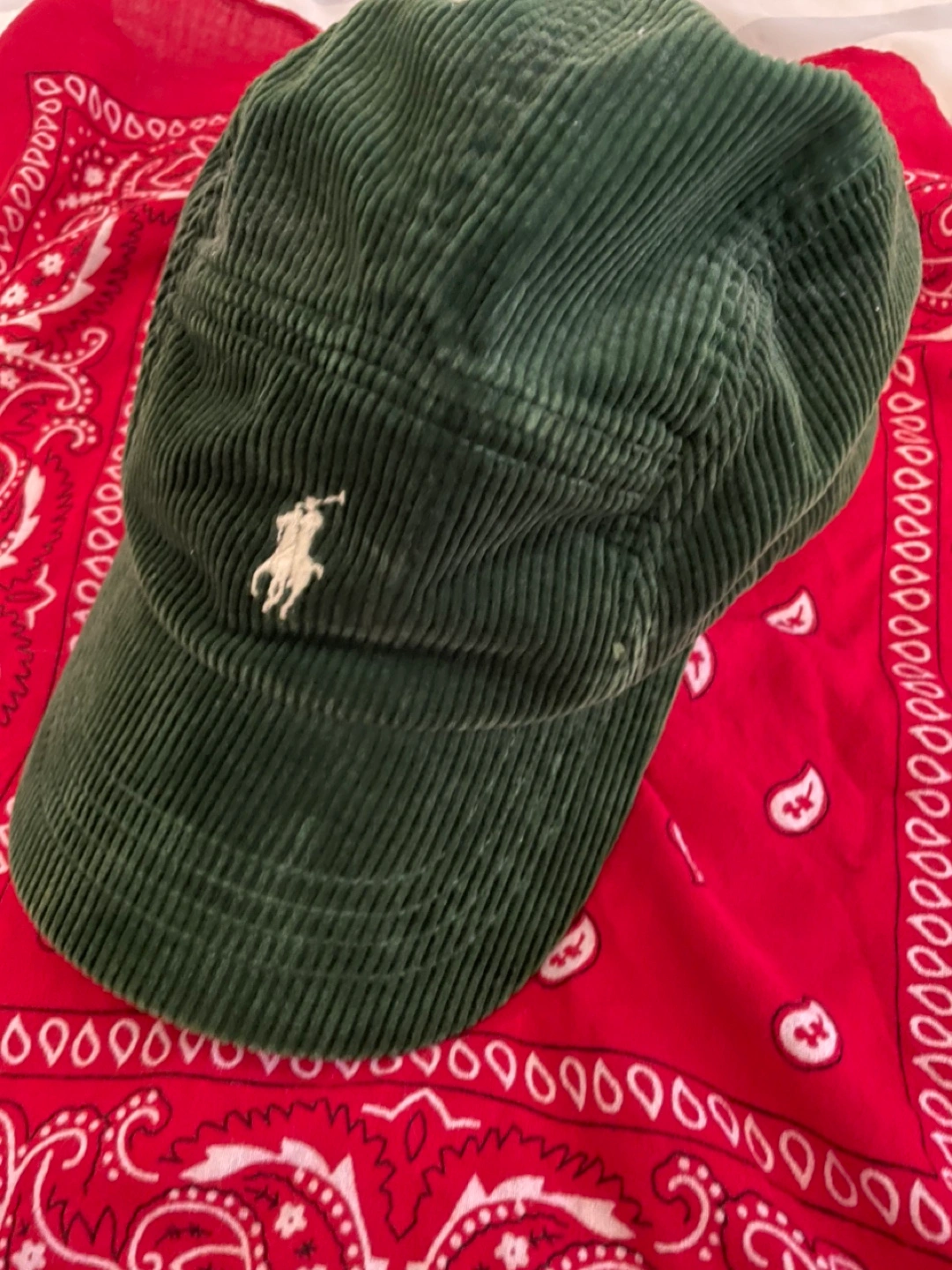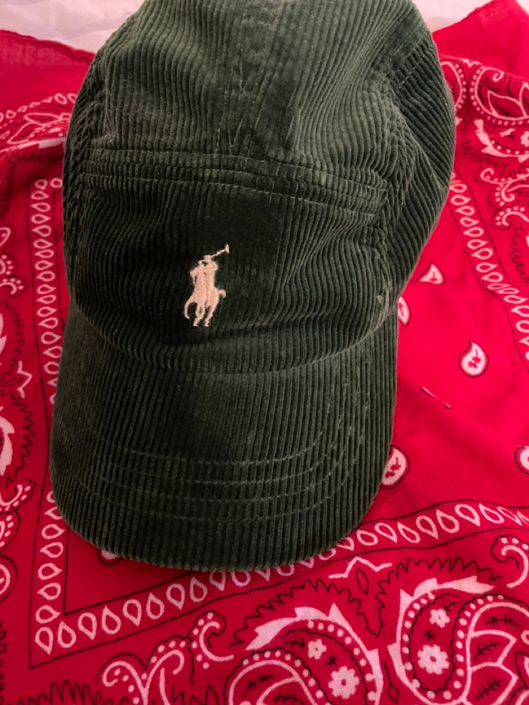 Brand New — Never Worn A green corduroy hat by Polo Ralph Lauren. It features a white polo player logo on the front of the hat. It has a leather strap on the back with a buckle for sizing. It is made of 100% cotton.