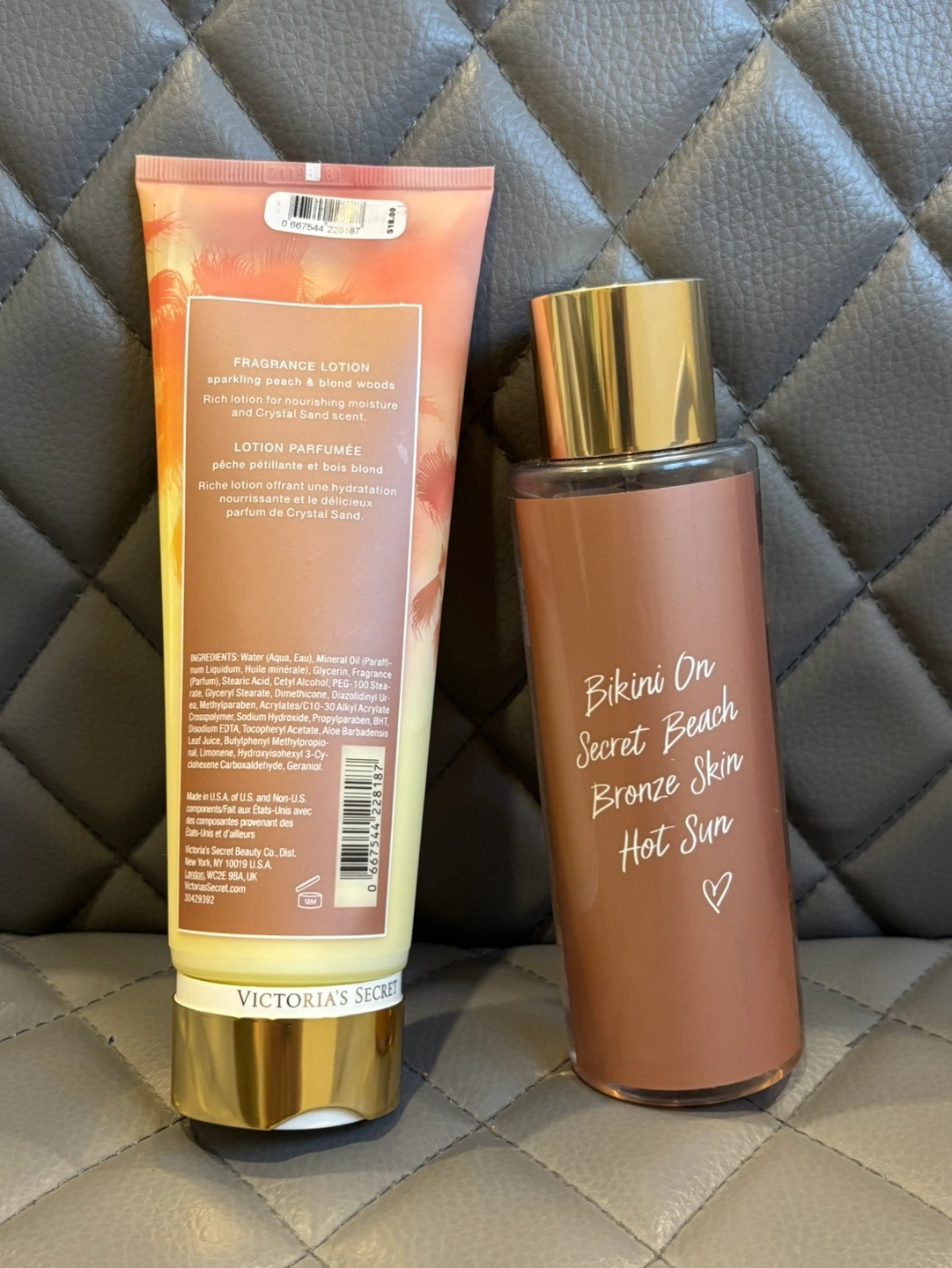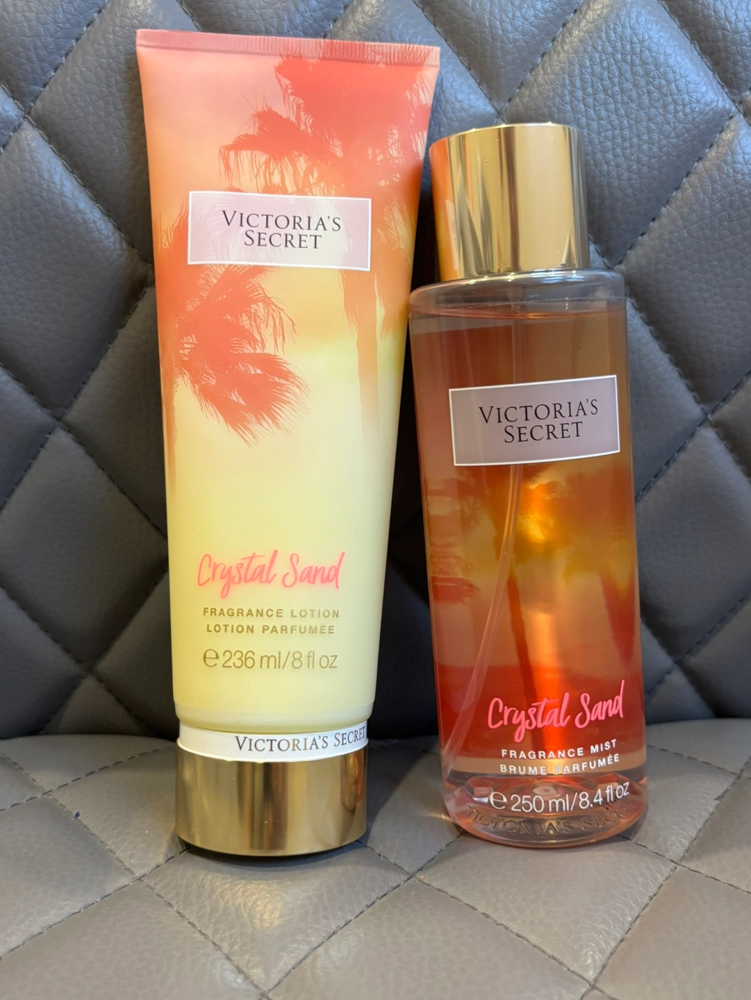 This listing is for a Victoria's Secret Crystal Sand Fragrance Mist and Lotion Set. The set includes a 250 ml/8.4 fl oz fragrance mist and a 236 ml/8 fl oz lotion. Both have never been used until recently to open and smell it.