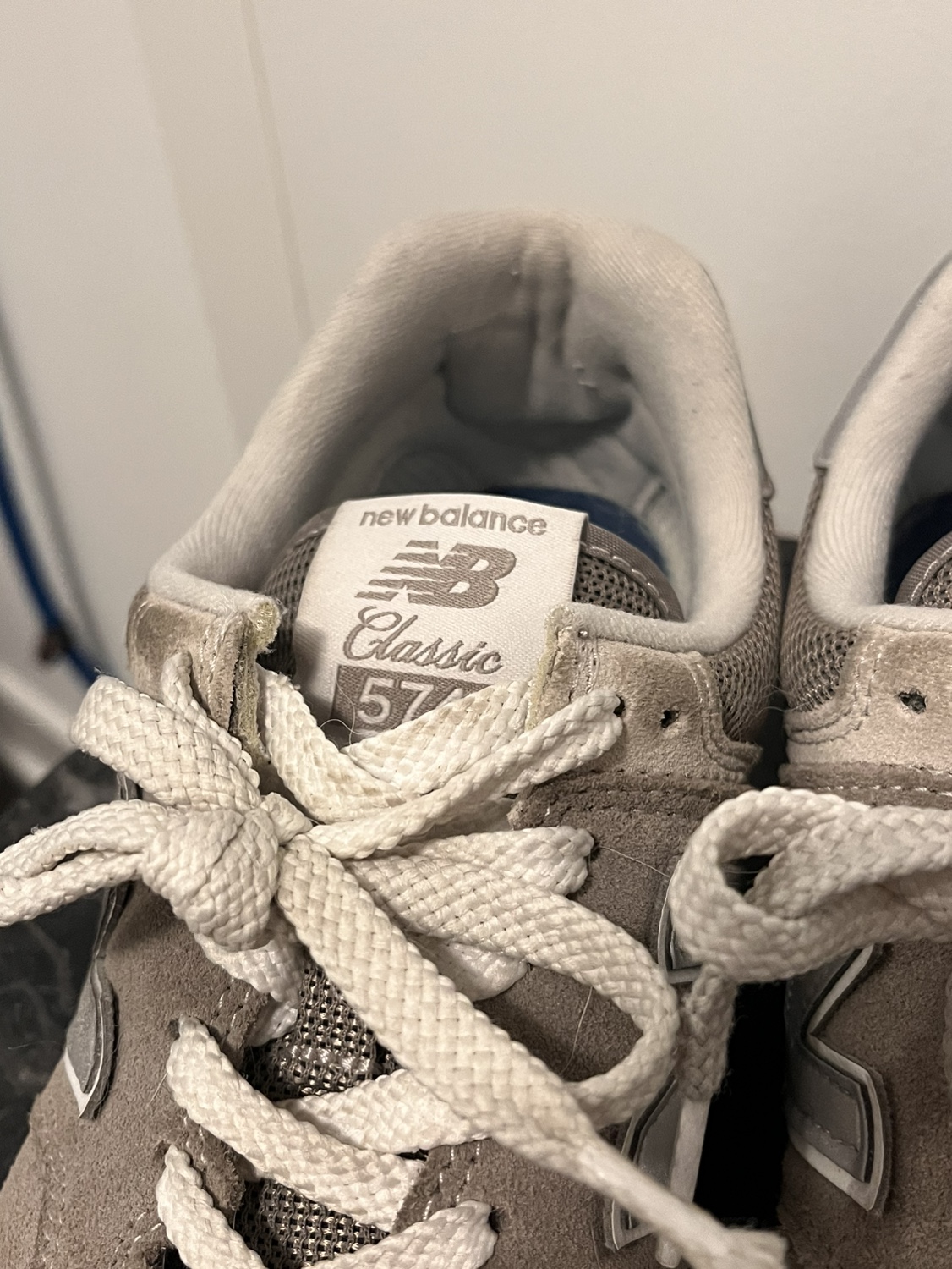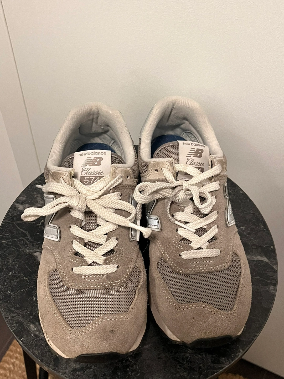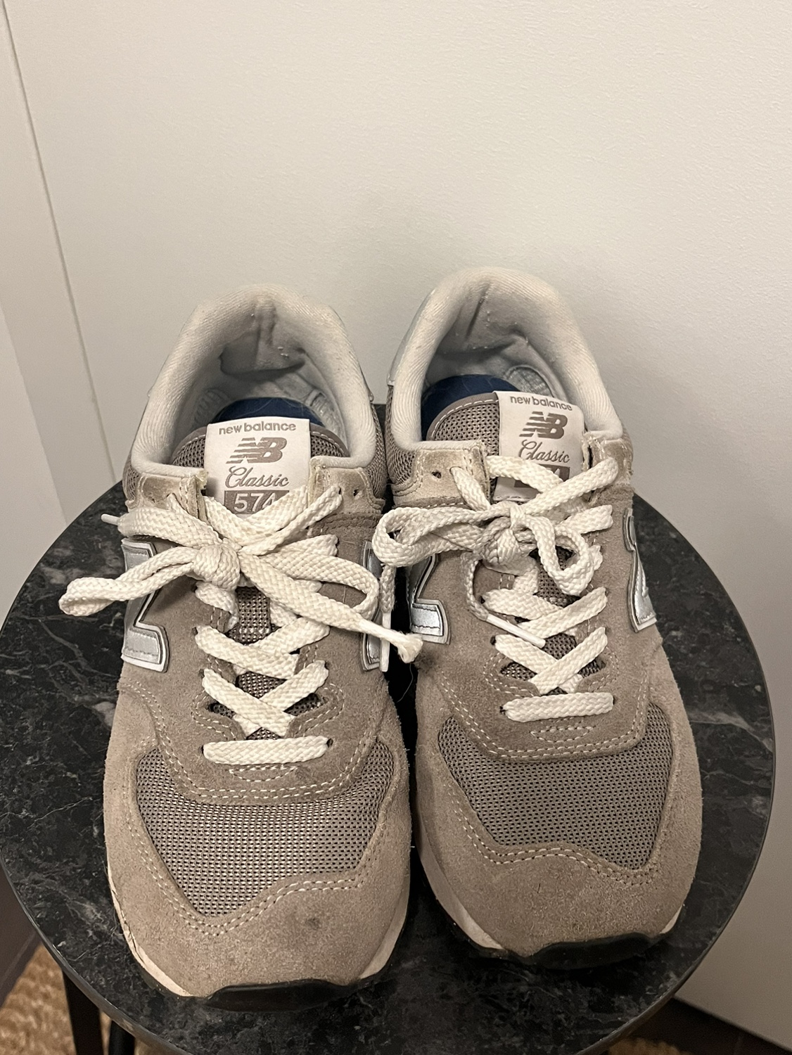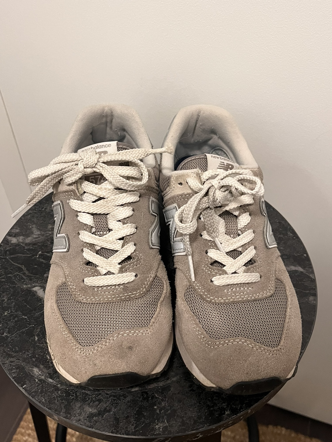 These are New Balance 574s in grey suede. They are size 7.5 women's.