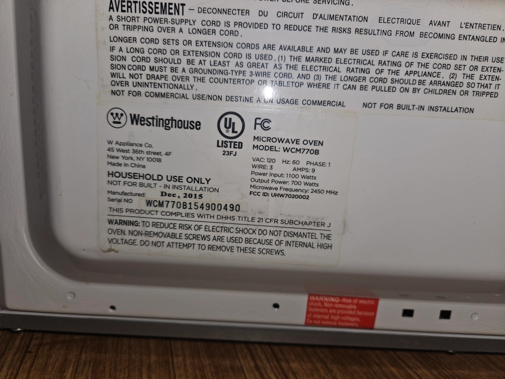 Westinghouse microwave oven. Includes turntable. The model number is WCM770B15490490. It is in good working condition. Great for small rooms, dorms, or offices. Works great, cleaned thoroughly.