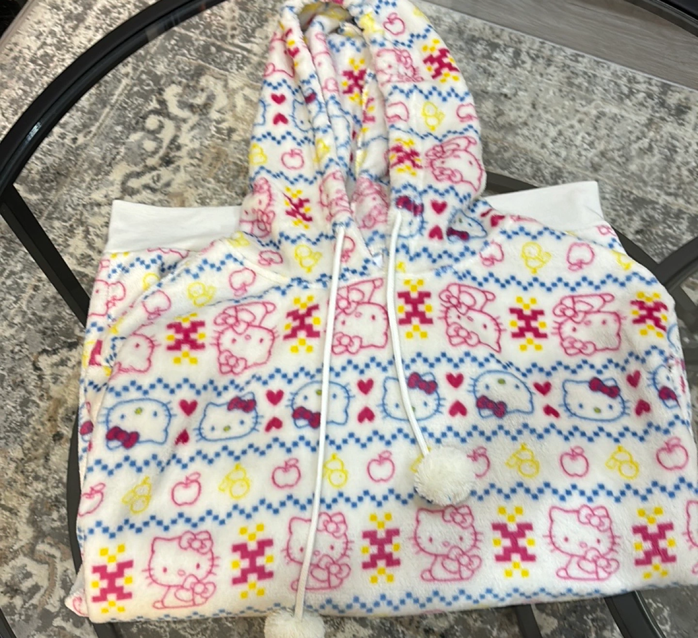 89A Hello Kitty hoodie with a white background and colourful print. It has a hood with white drawstrings and a pom-pom on each drawstring. Cozy Size medium - pit to pit posted Official merchandise Tag removed
