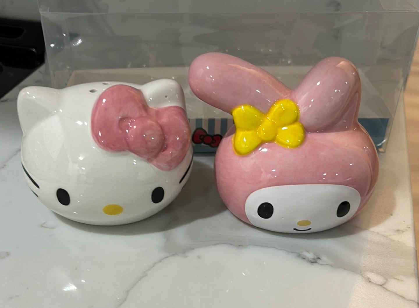 89A set of Hello Kitty and My Melody salt and pepper shakers. Each shaker is shaped like the character and has a pink bow.