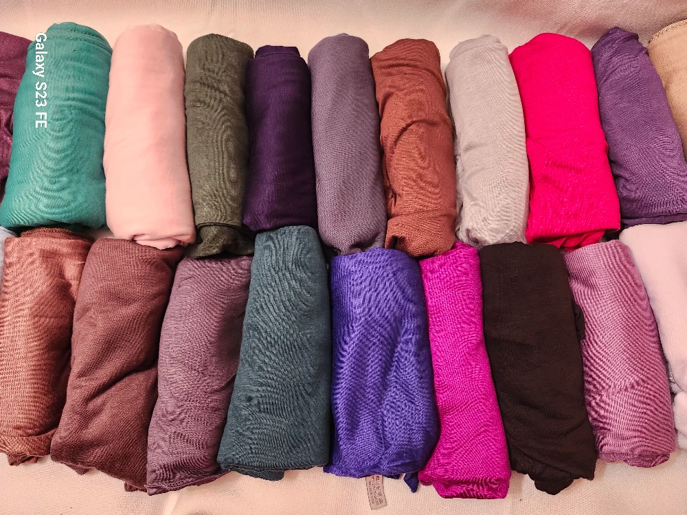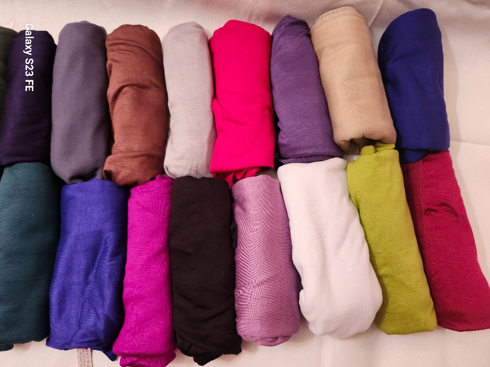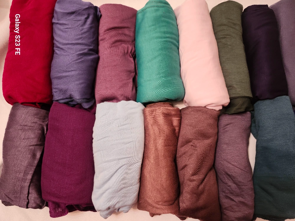 A pack of 20 assorted coloured and patterned hijabs. All are in good condition and ready to be worn.