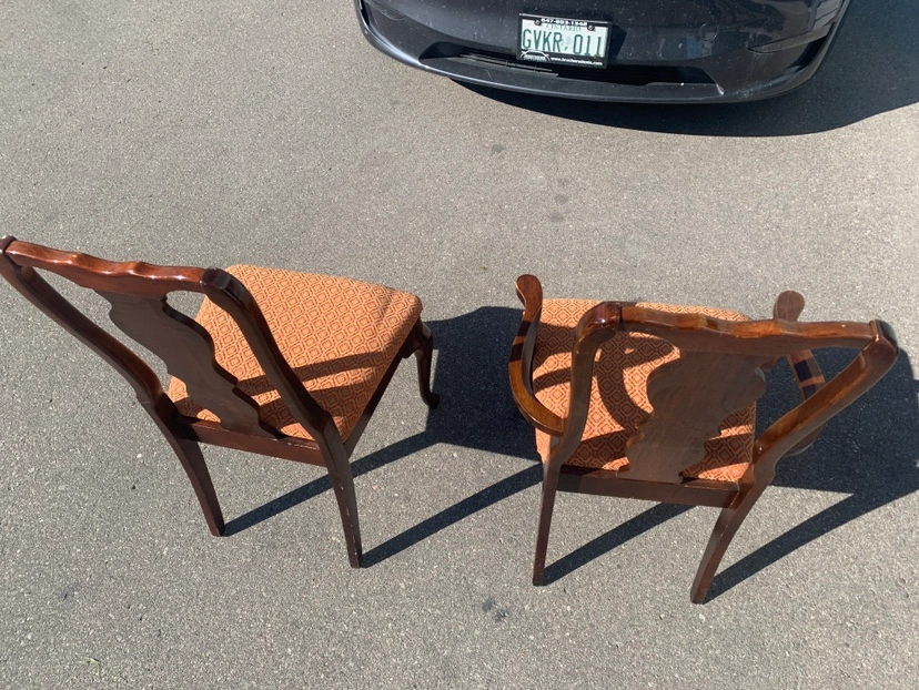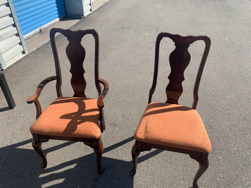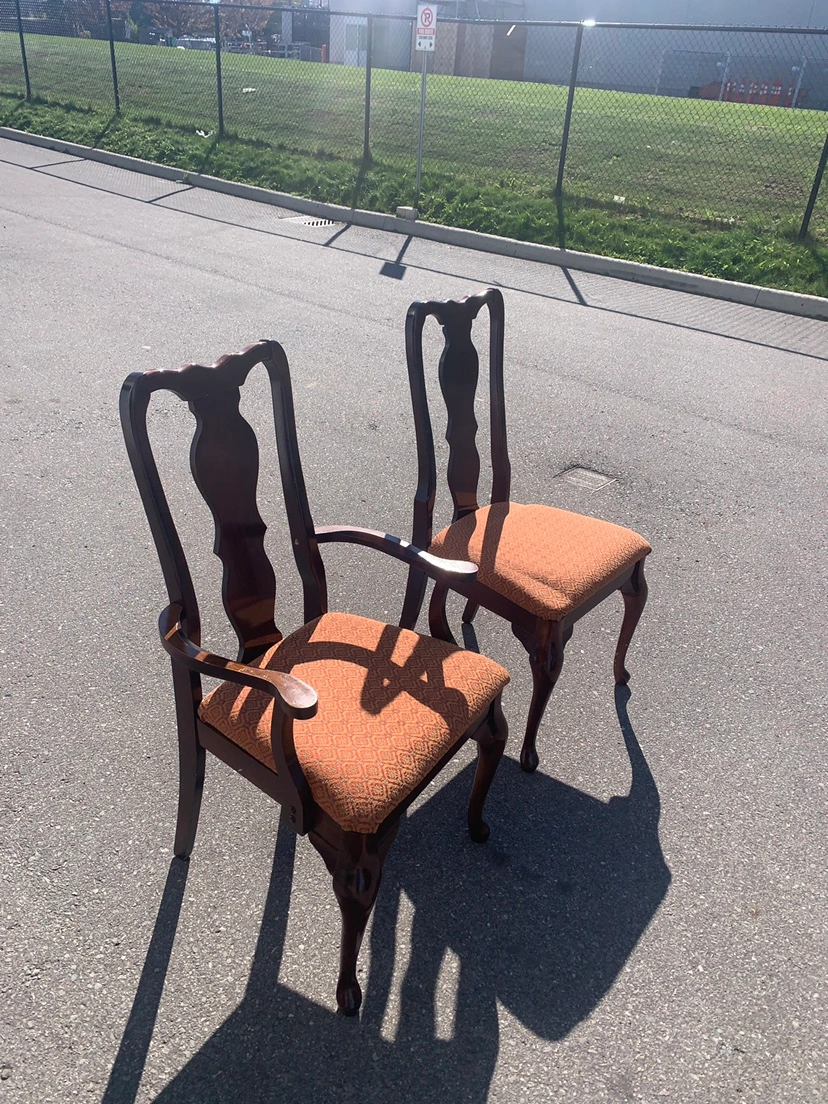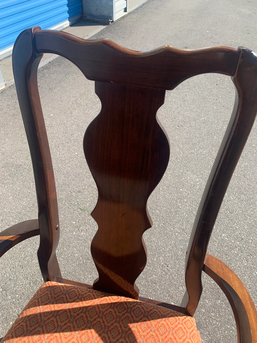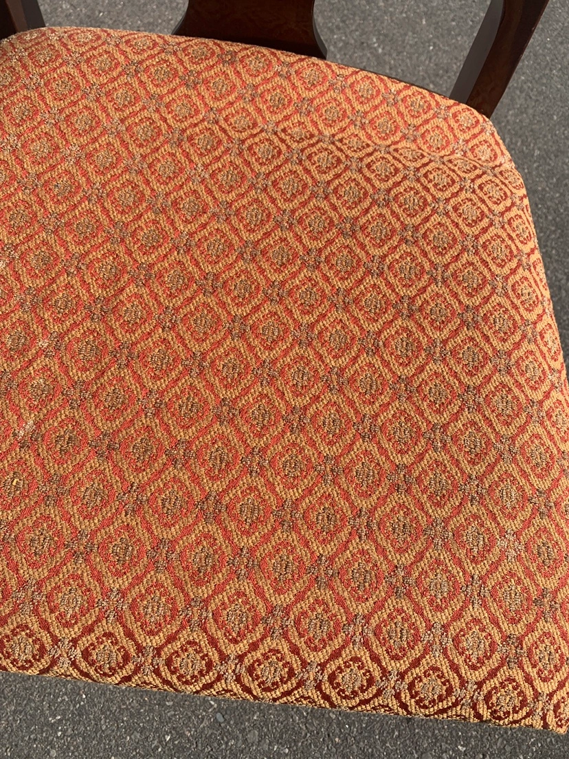 Set of six dining room chairs with upholstered seats and backs. The chairs are in a dark wood with a cabriole leg. Four chairs has arms and two chair does not. The newly upholstery is a patterned fabric in burgundy red. $25 each or $120 for all.