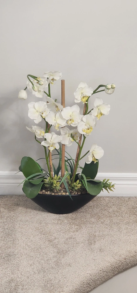 This is a beautiful white orchid arrangement in a black pot. The arrangement includes multiple white orchids and greenery. The arrangement is perfect for adding a touch of elegance to your home.