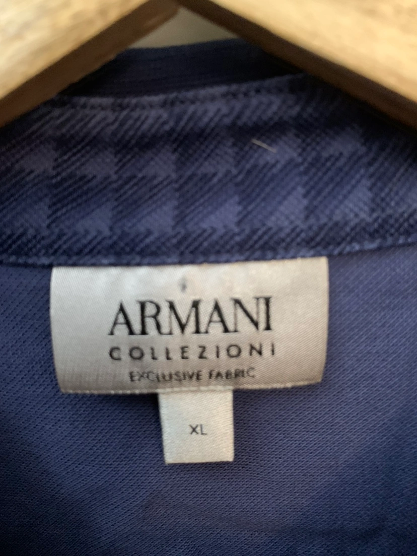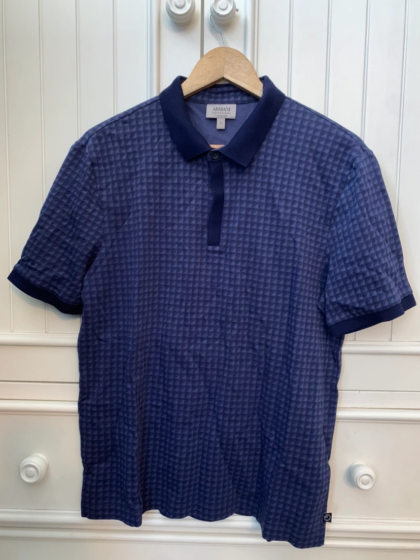 Size XL, navy blue, short sleeve, with geometric pattern throughout. Made with "Exclusive Fabric". Button closure. A clean, stylish polo shirt. ✅Used But Good condition