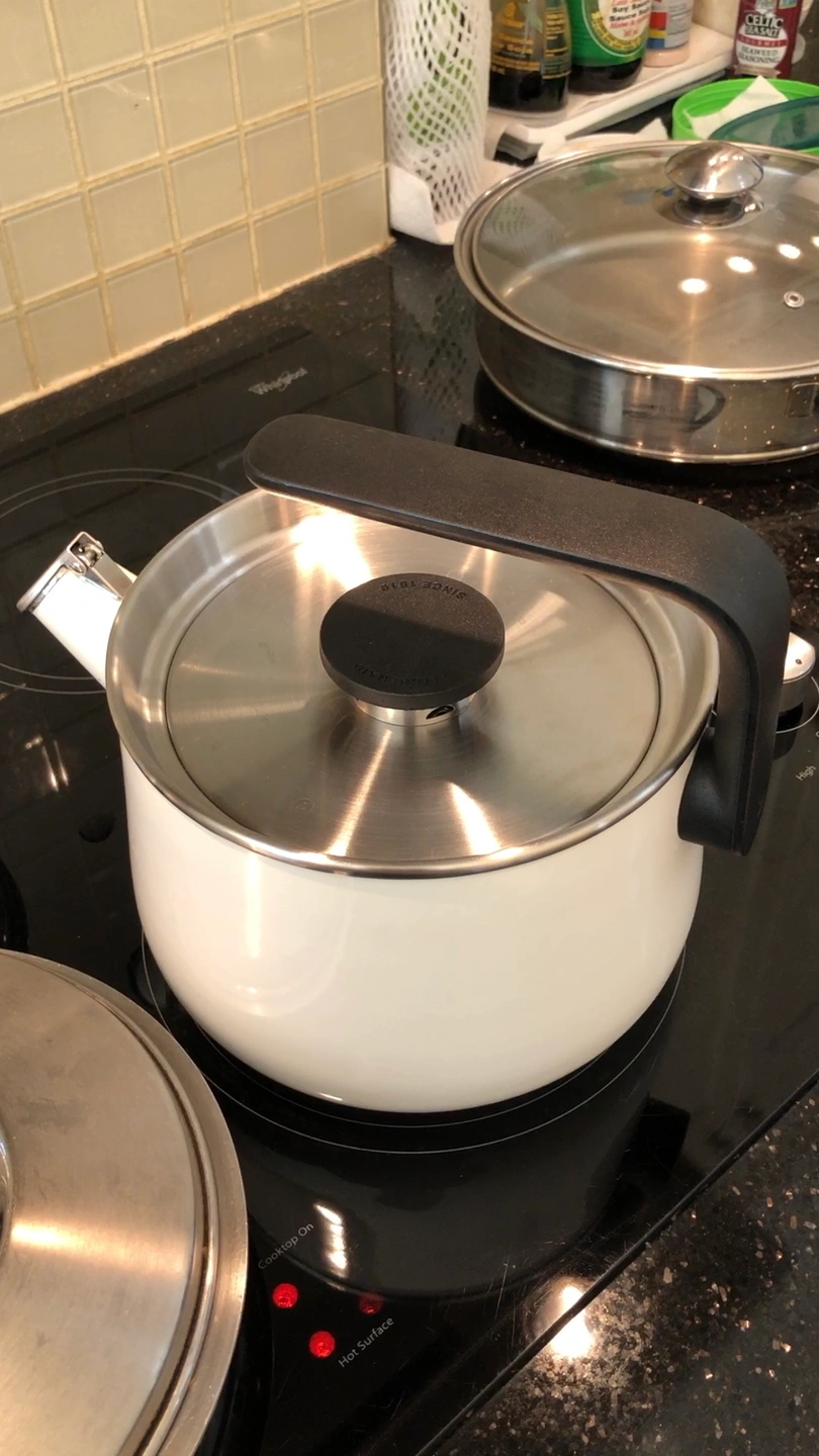Whistling slots in stainless steel lid. Spout has flip-top cover. Induction-ready.