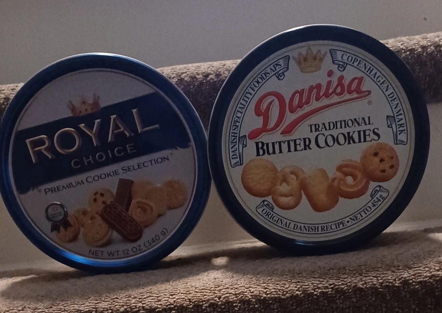 Two empty cookie tins. One is from Royal Choice and the other is from Danisa.