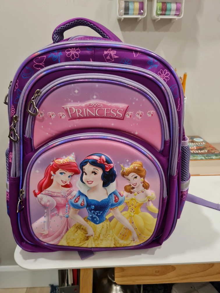 Purple backpack with a princess design, featuring Ariel, Snow White, and Belle. The backpack has a mesh pocket on the side and reflective strips. brand new
