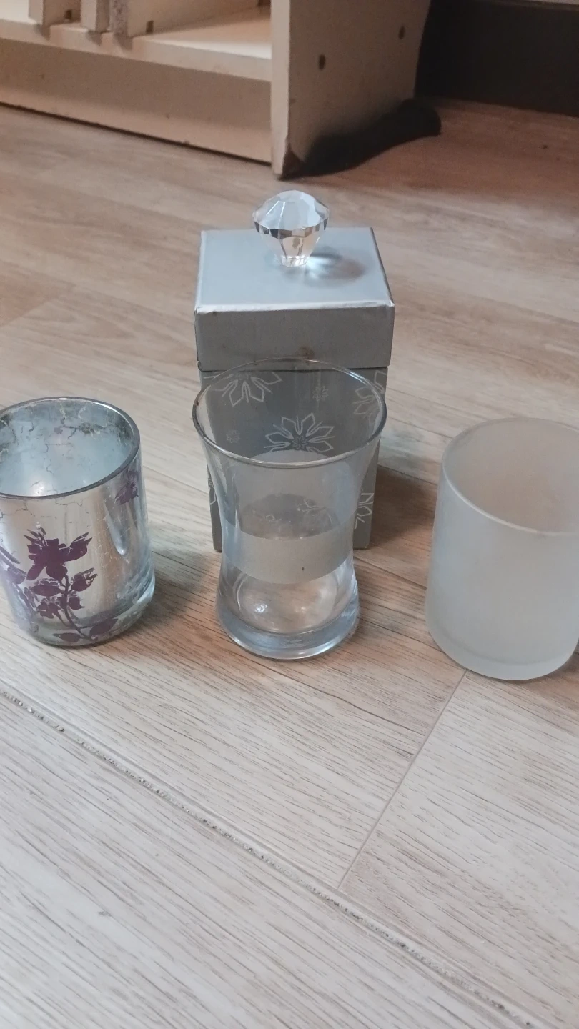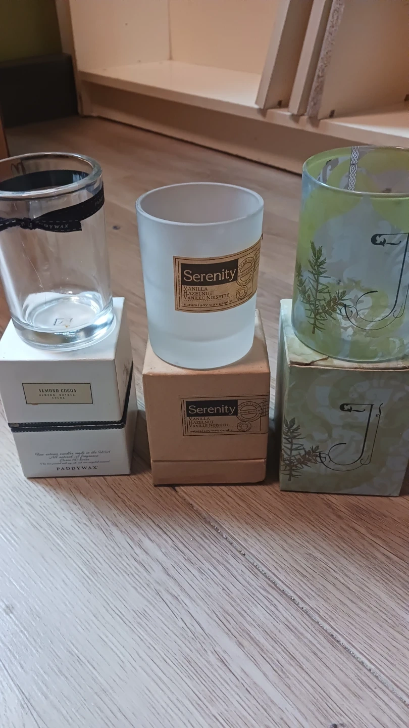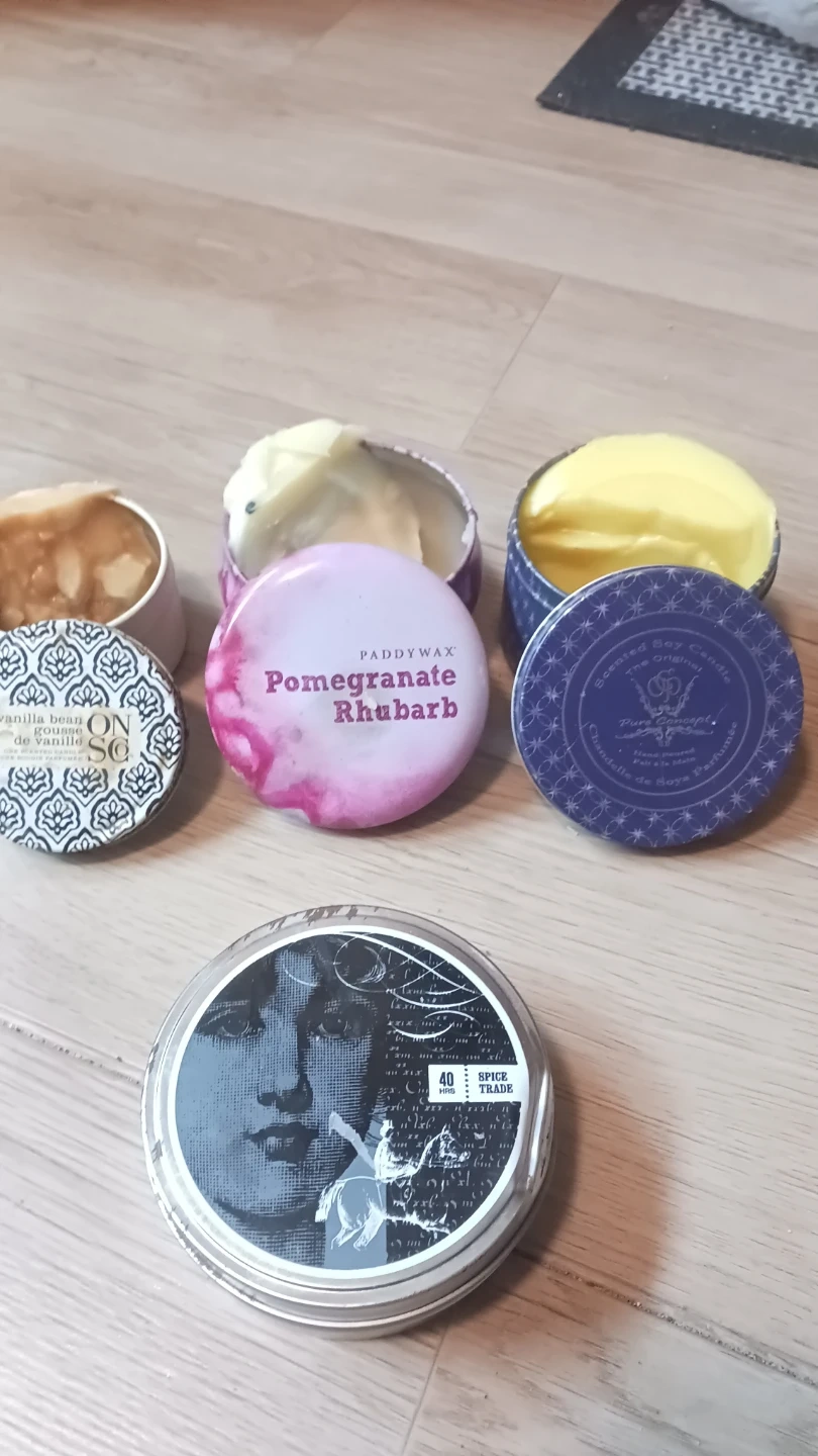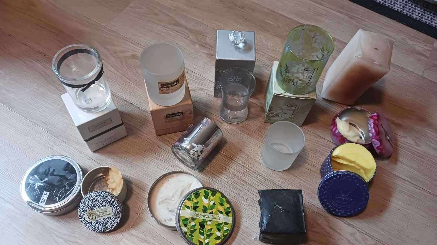 These candle jars/cups and matching boxes are available for anyone who makes candles of their own... there are scented wax pillars that got melted slightly by heat. Plus scented wax in some containers that can be reused as well as their containers! Any artist interested the whole lot is just $10. 13 pieces could be sold for about $3 - 5 a piece! What a great deal! 🤓