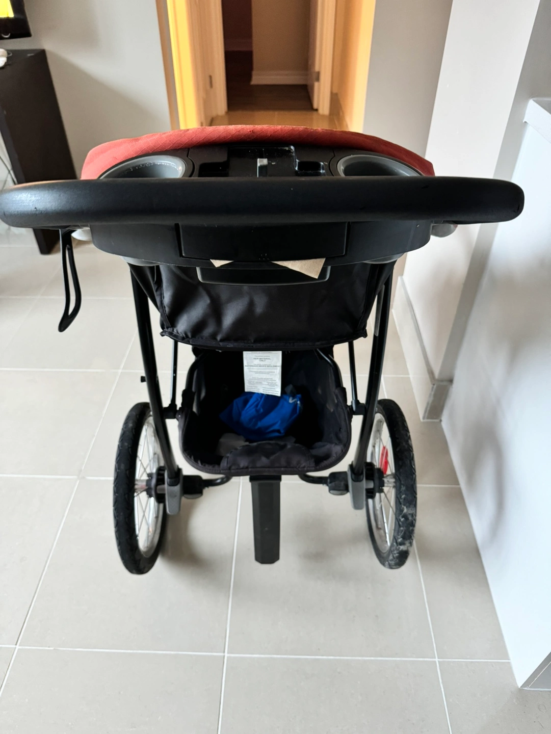 The stroller features a large storage basket and a cup holder. It is a three-wheeled stroller with a swivel front wheel.