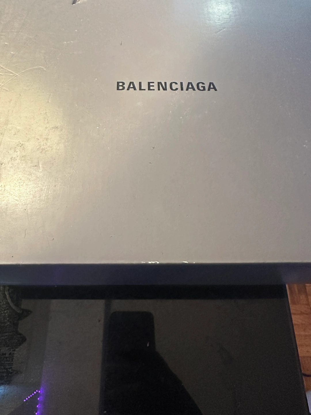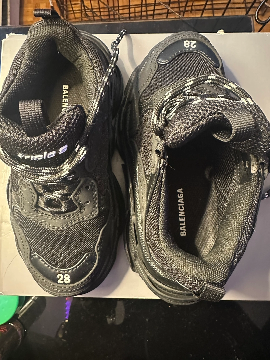 These are black Balenciaga Triple S sneakers, size 28 (EU). They have a chunky sole with a black and white design, and a black mesh upper with a white logo. They also feature a black and white shoelace.