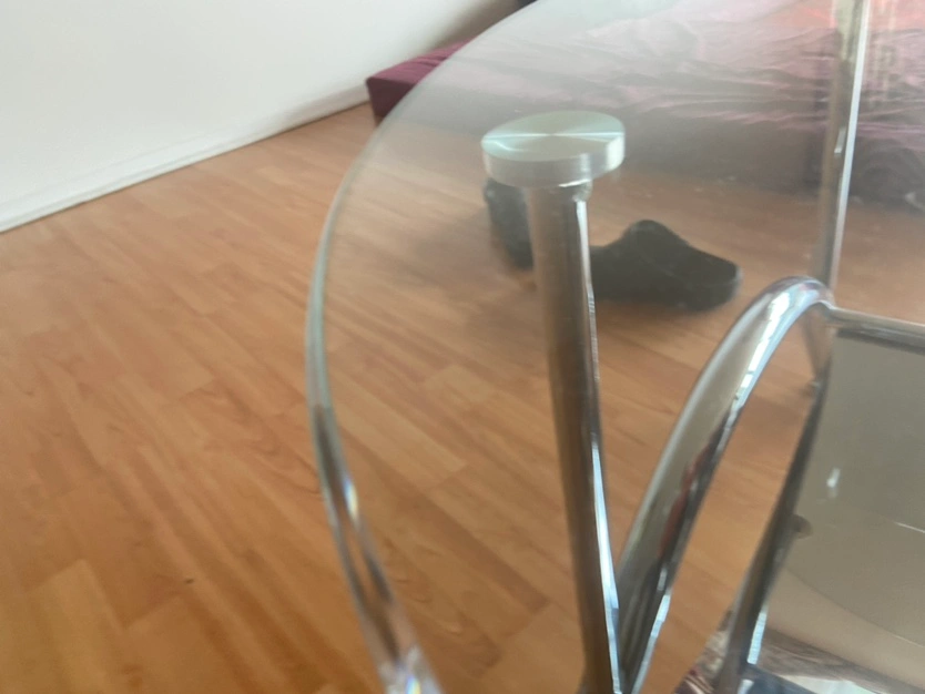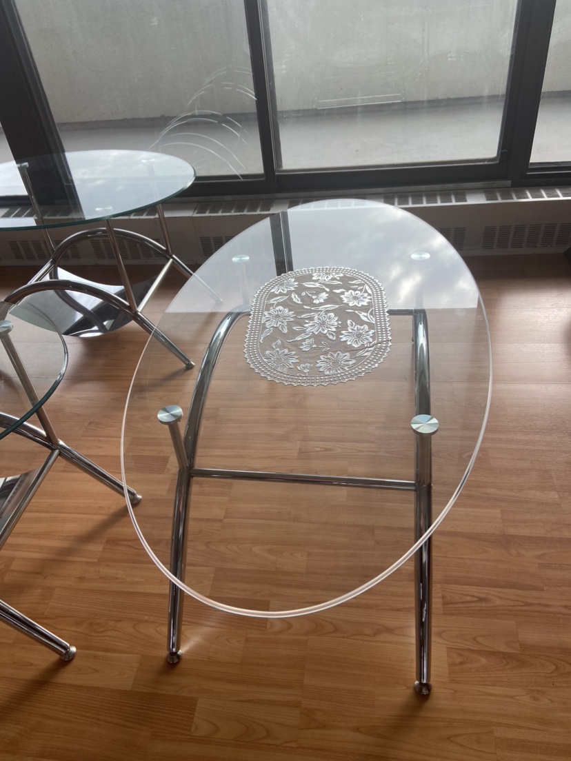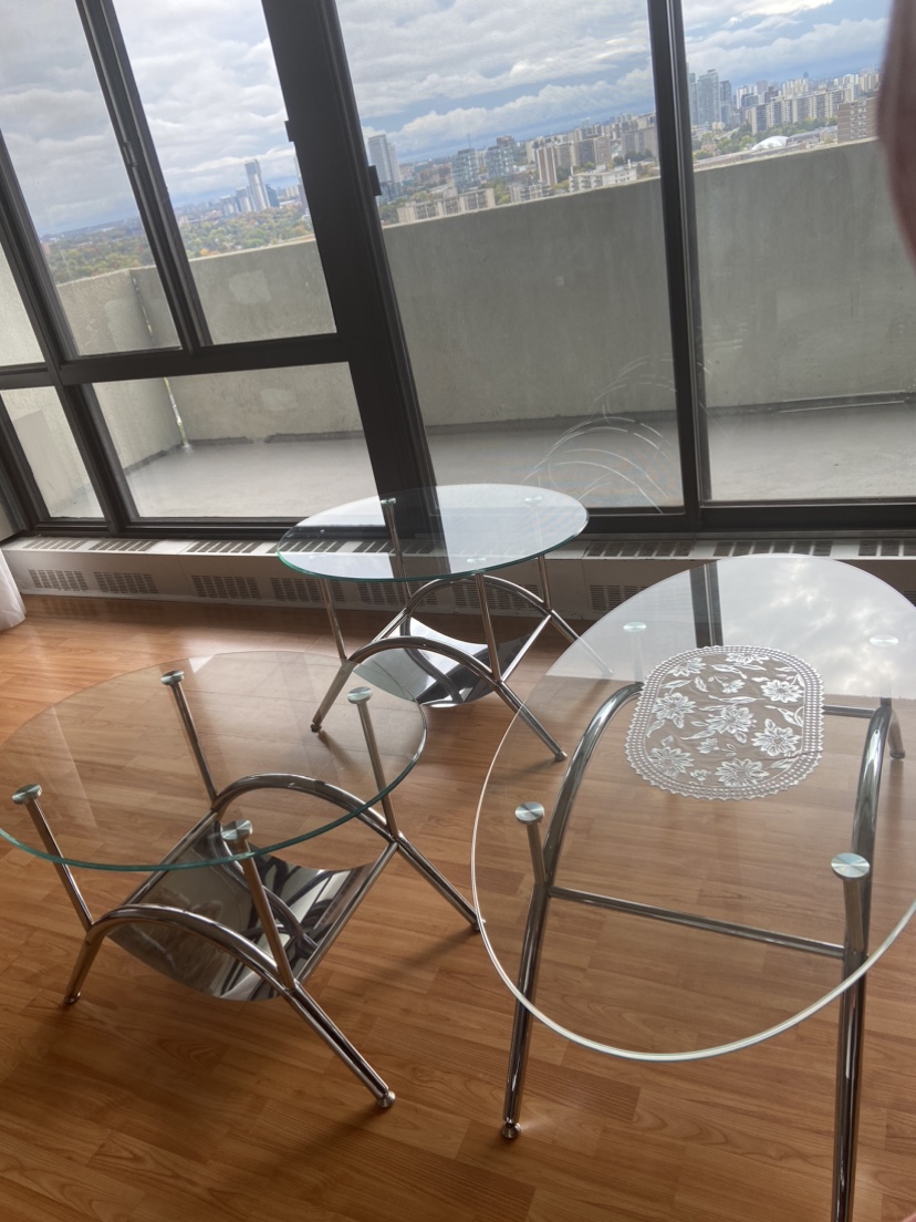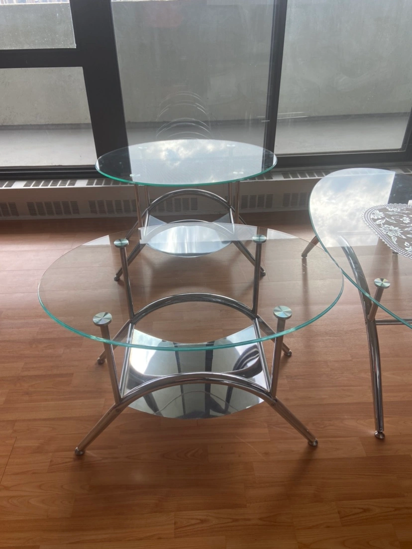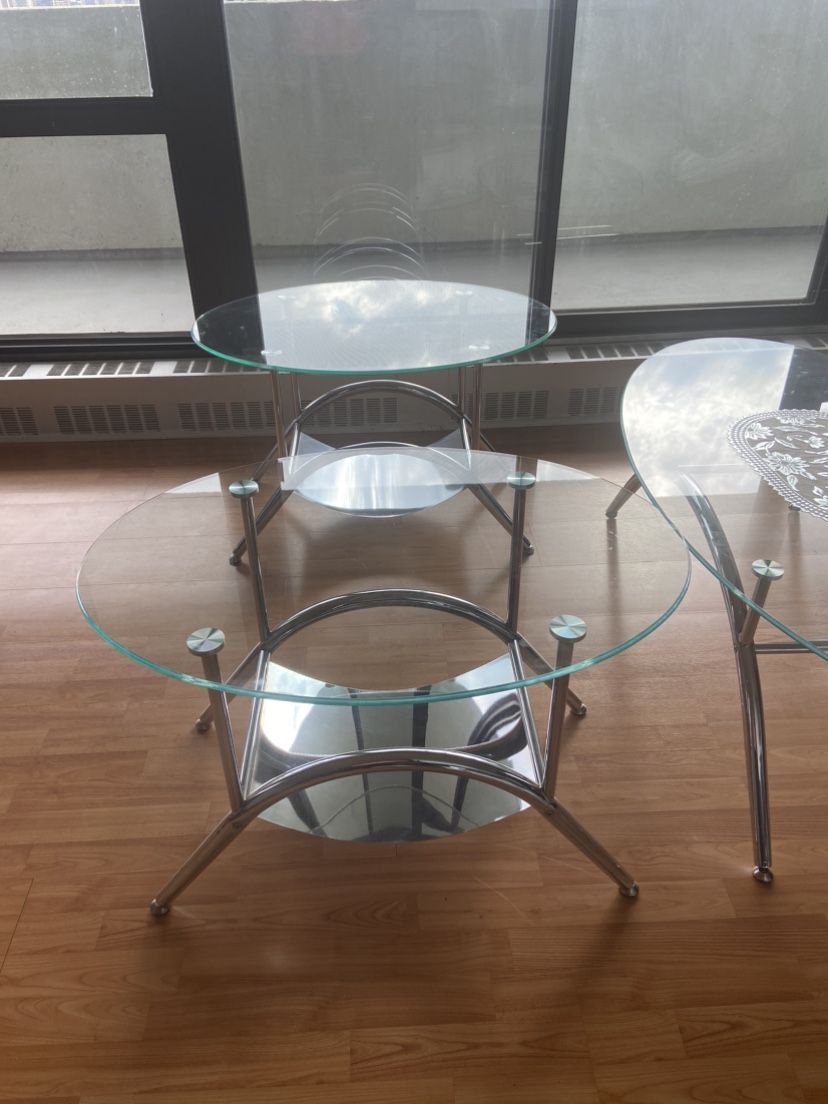 Set of three coffee tables with glass tops and chrome frames. One round table and two oval tables. Only cash