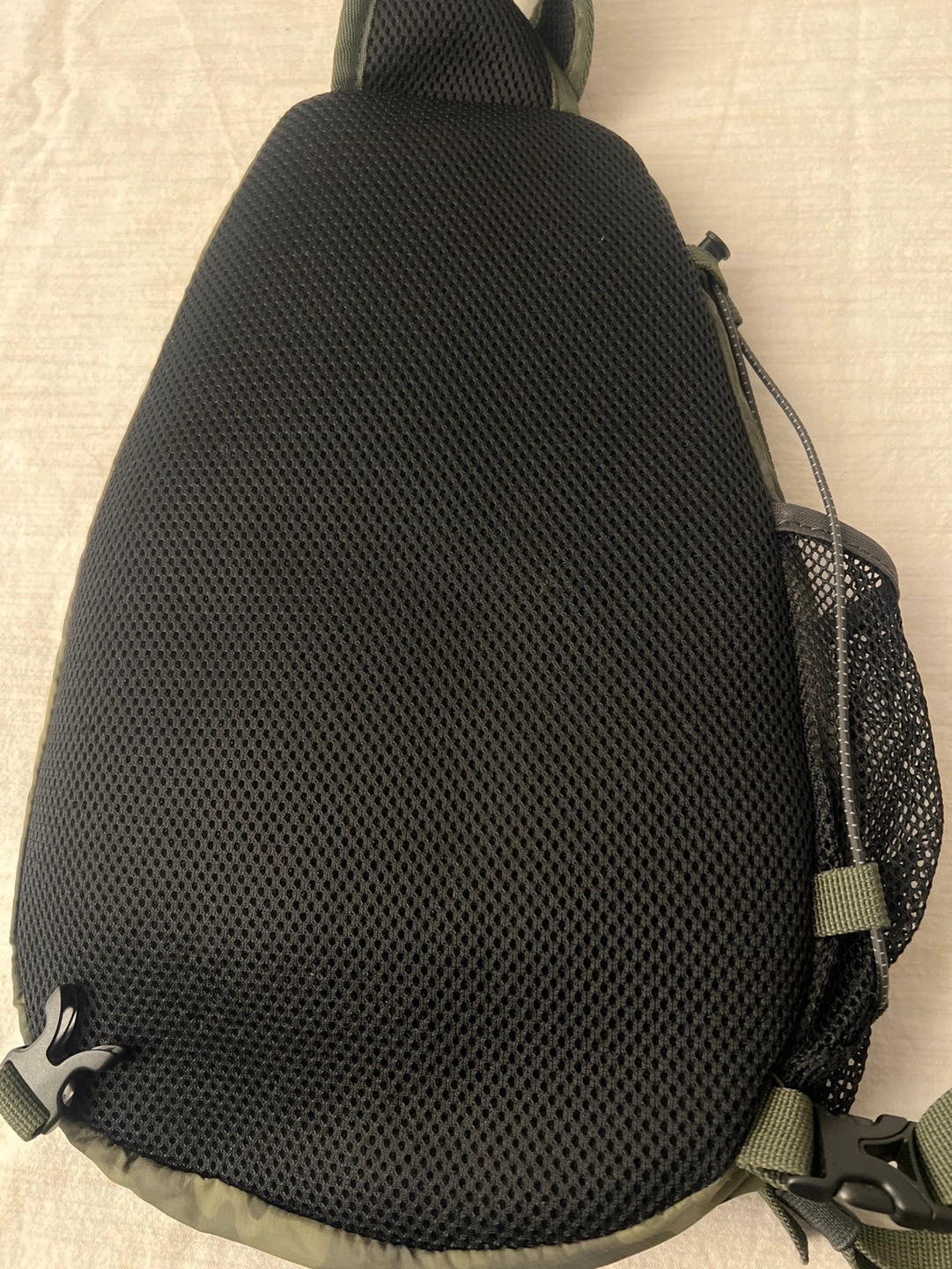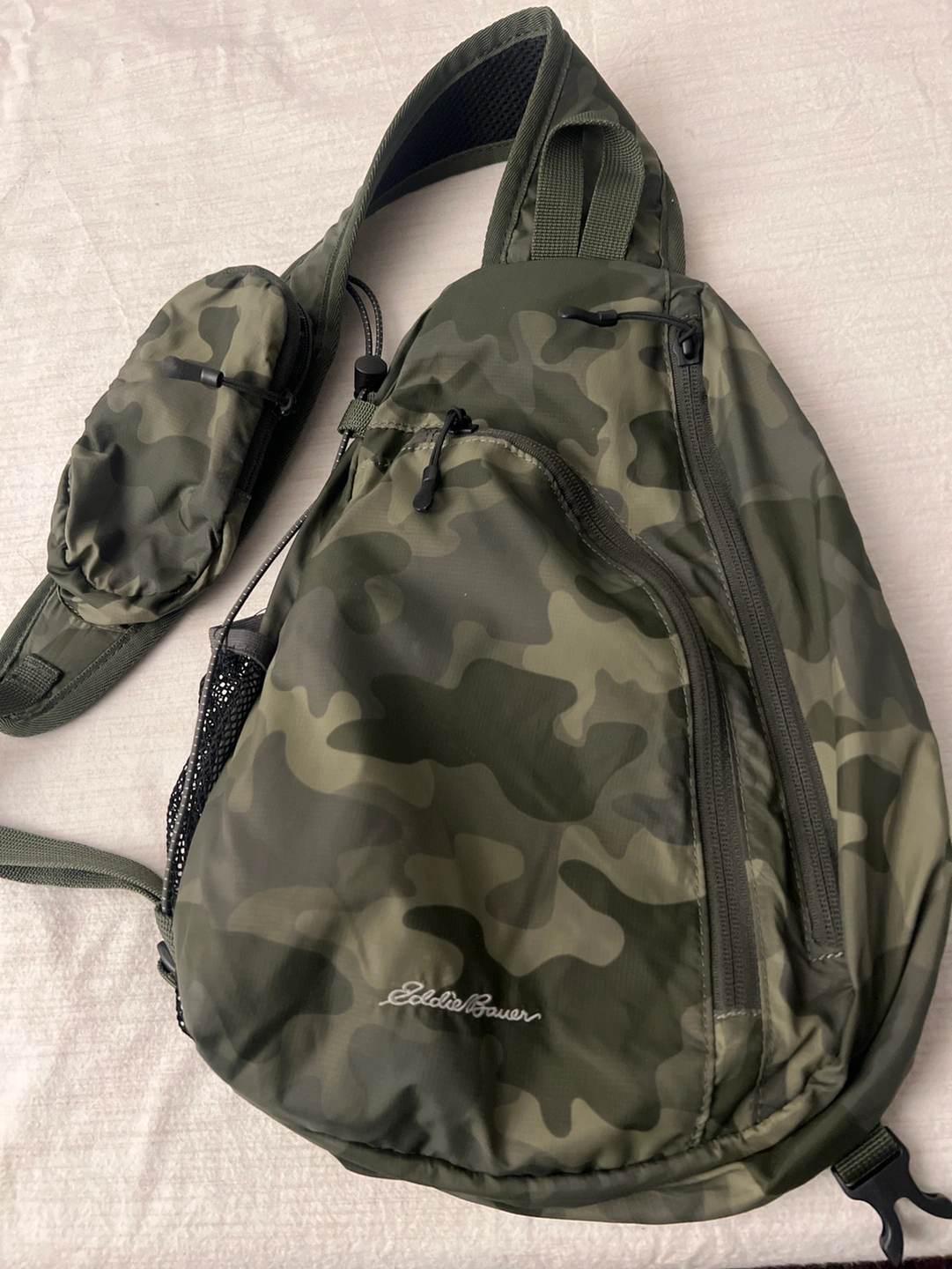 A camo sling bag from Eddie Bauer. The bag features a main compartment, a front pocket, and a side pocket. The adjustable strap is padded and comfortable.