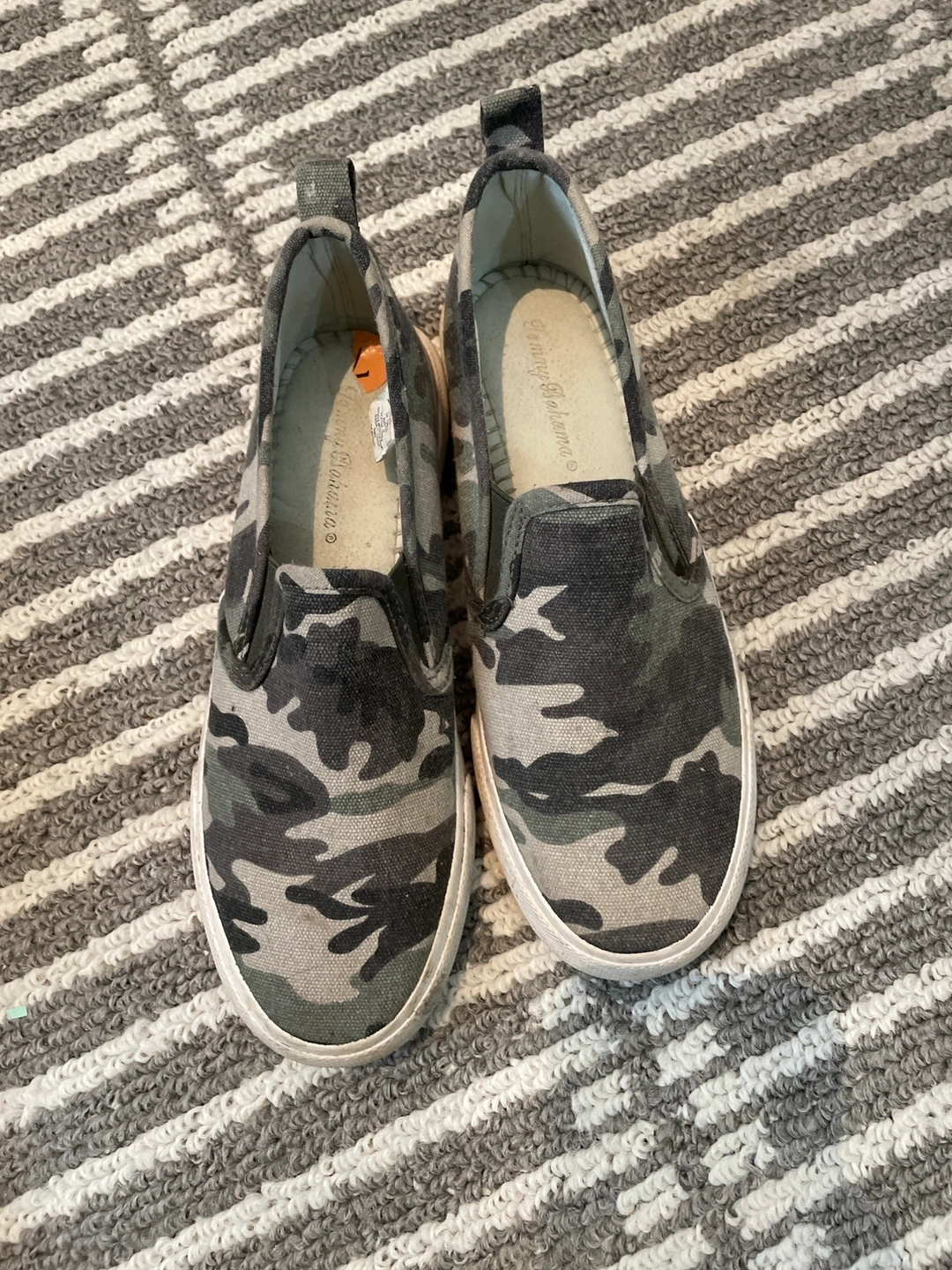 Pair of camouflage slip-on shoes. The shoes are a canvas material with a rubber sole. They are in good condition with no visible damage. The shoes are a size 7. They are comfortable and stylish. They would be perfect for everyday wear or for a casual outing.