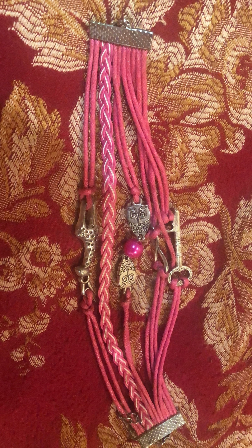 A multi-strand pink braided bracelet with charms. It has a key, an owl and a giraffe charm. The bracelet is adjustable.