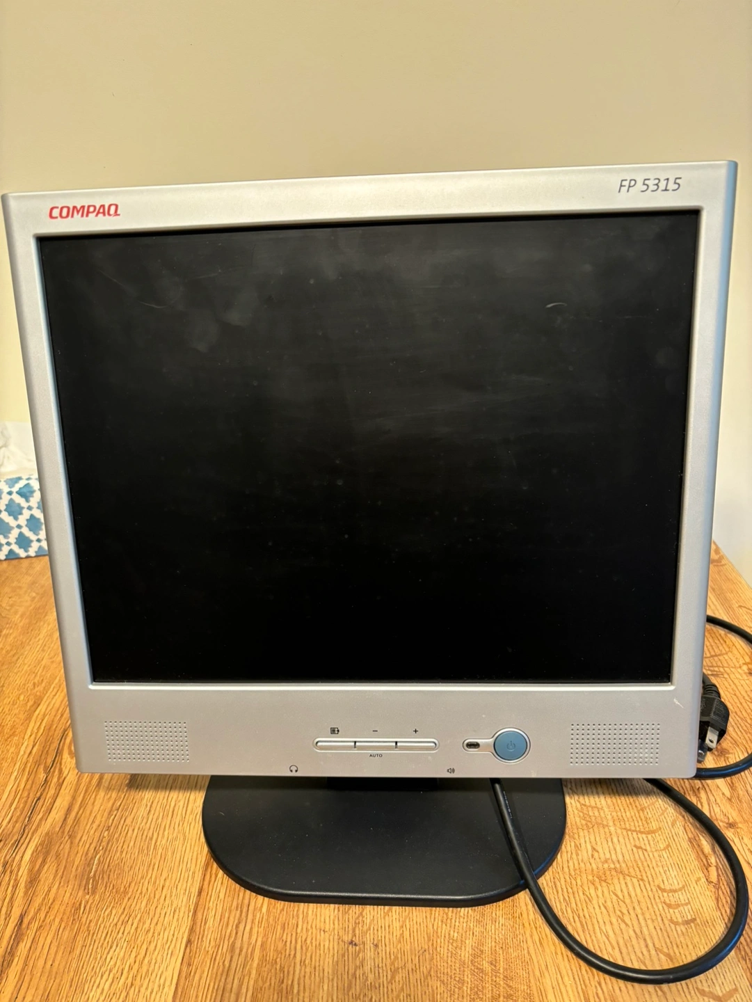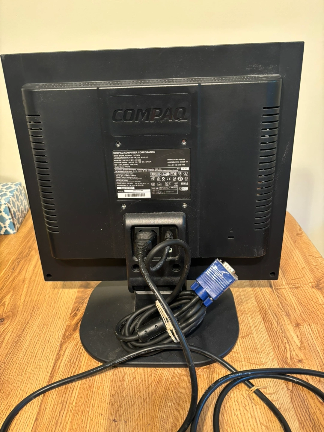 Compaq 15” LCD monitor with speaker, comes with power cord and VGA cable.