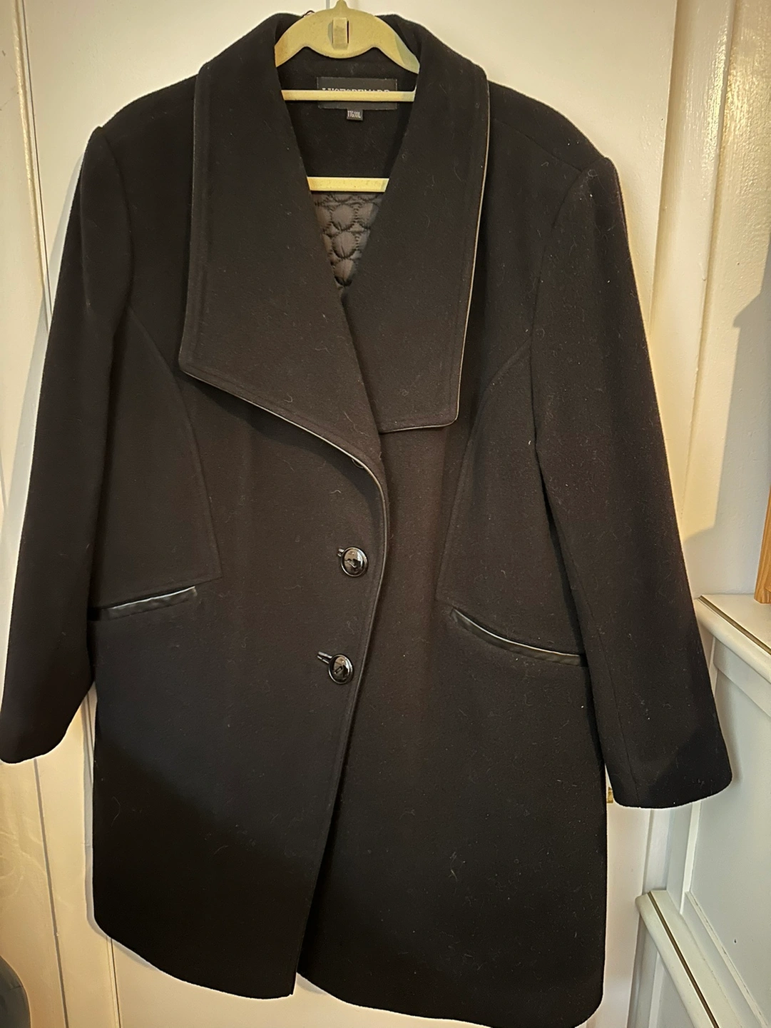 This is a long, black coat with a collar and buttons. Worn a couple times, no holes or tears, buttons are secure and inside lining is fully intact. Smoke free.