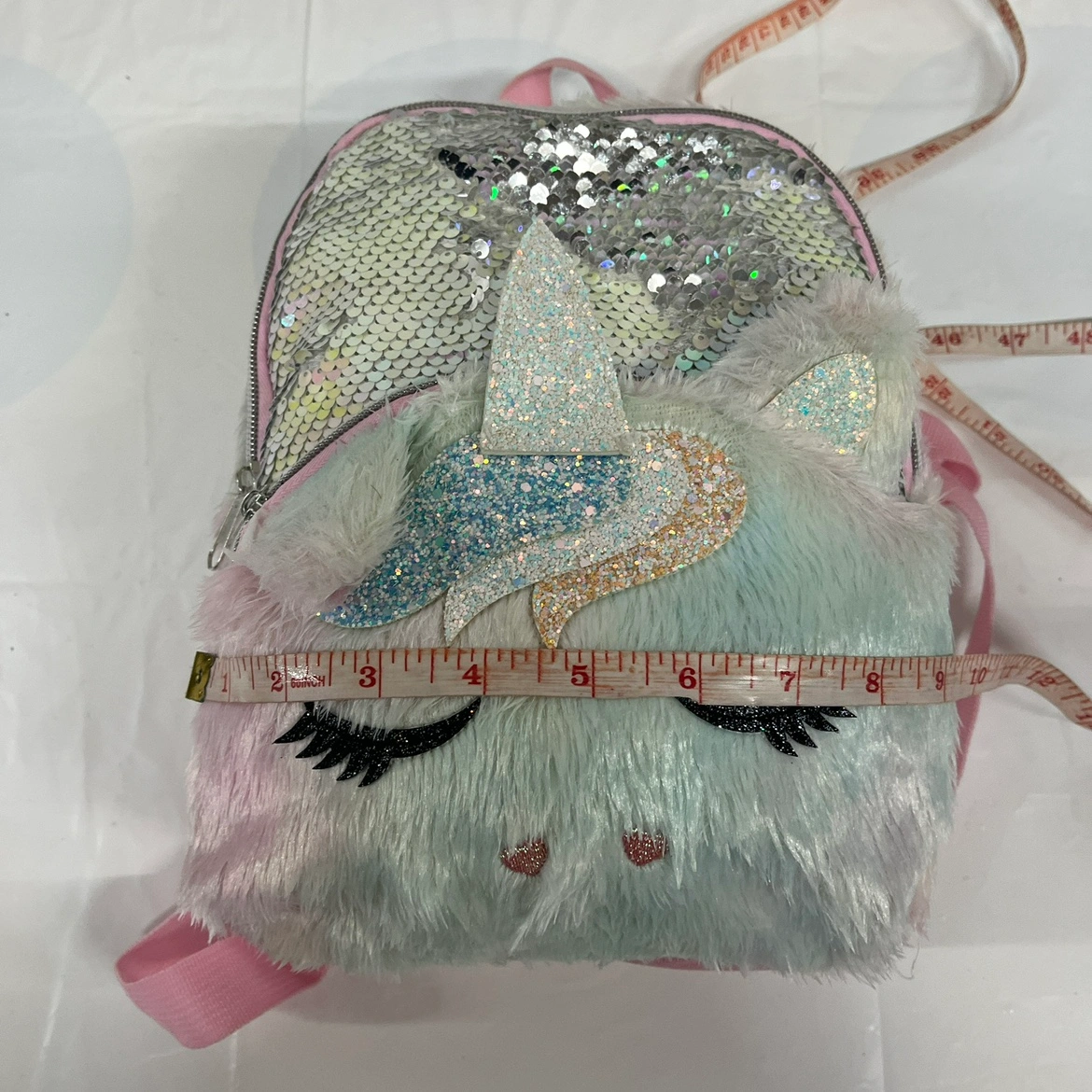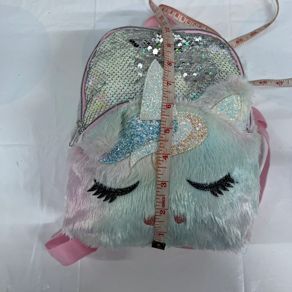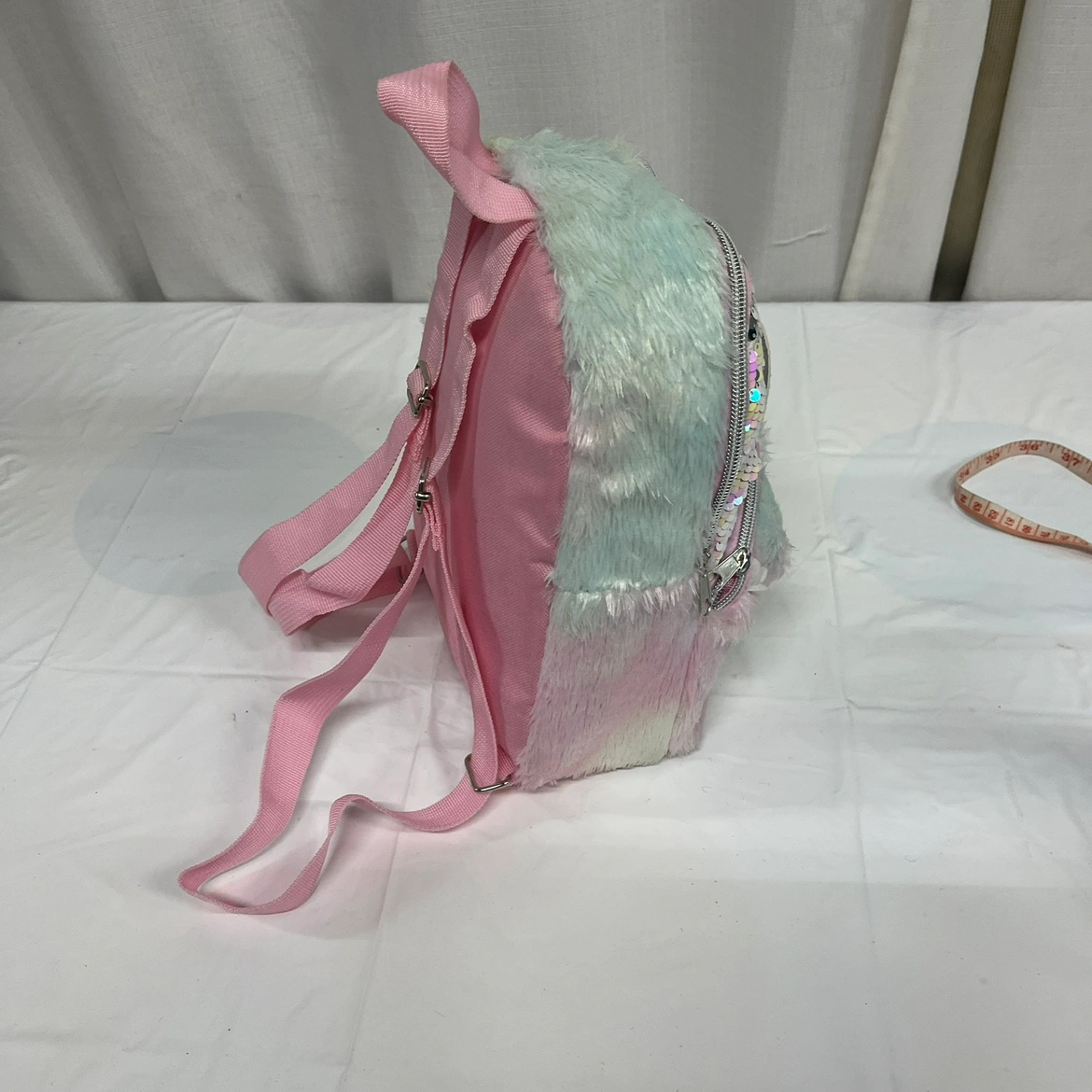 Small, pink and blue fuzzy backpack with sequins on the back. Perfect for a little girl. It has a zipper closure, two adjustable straps, and a small handle on the top.