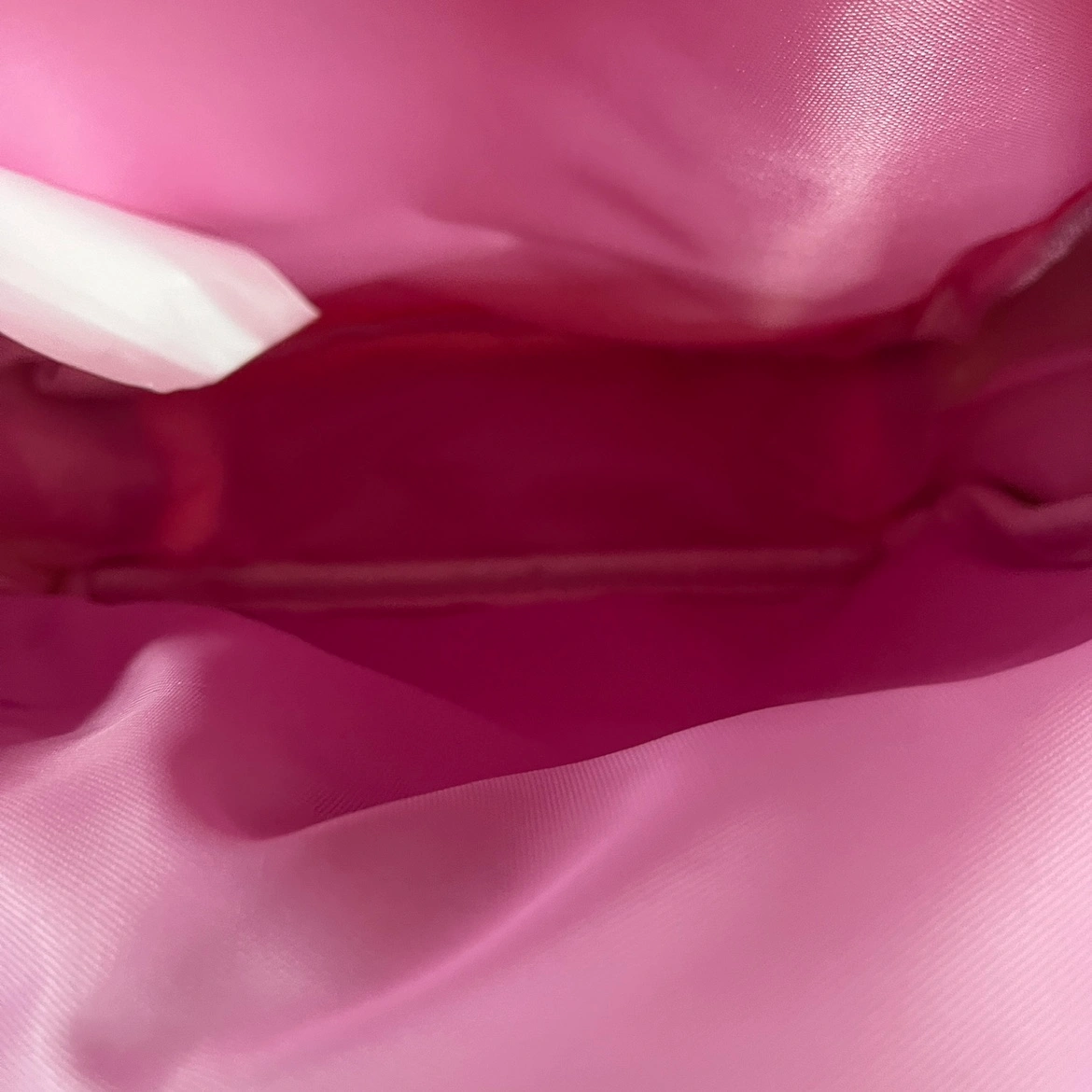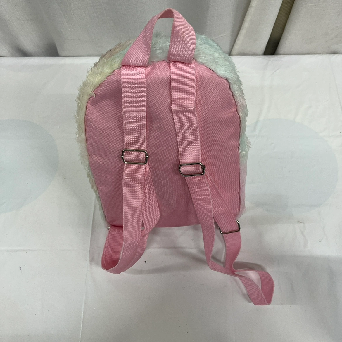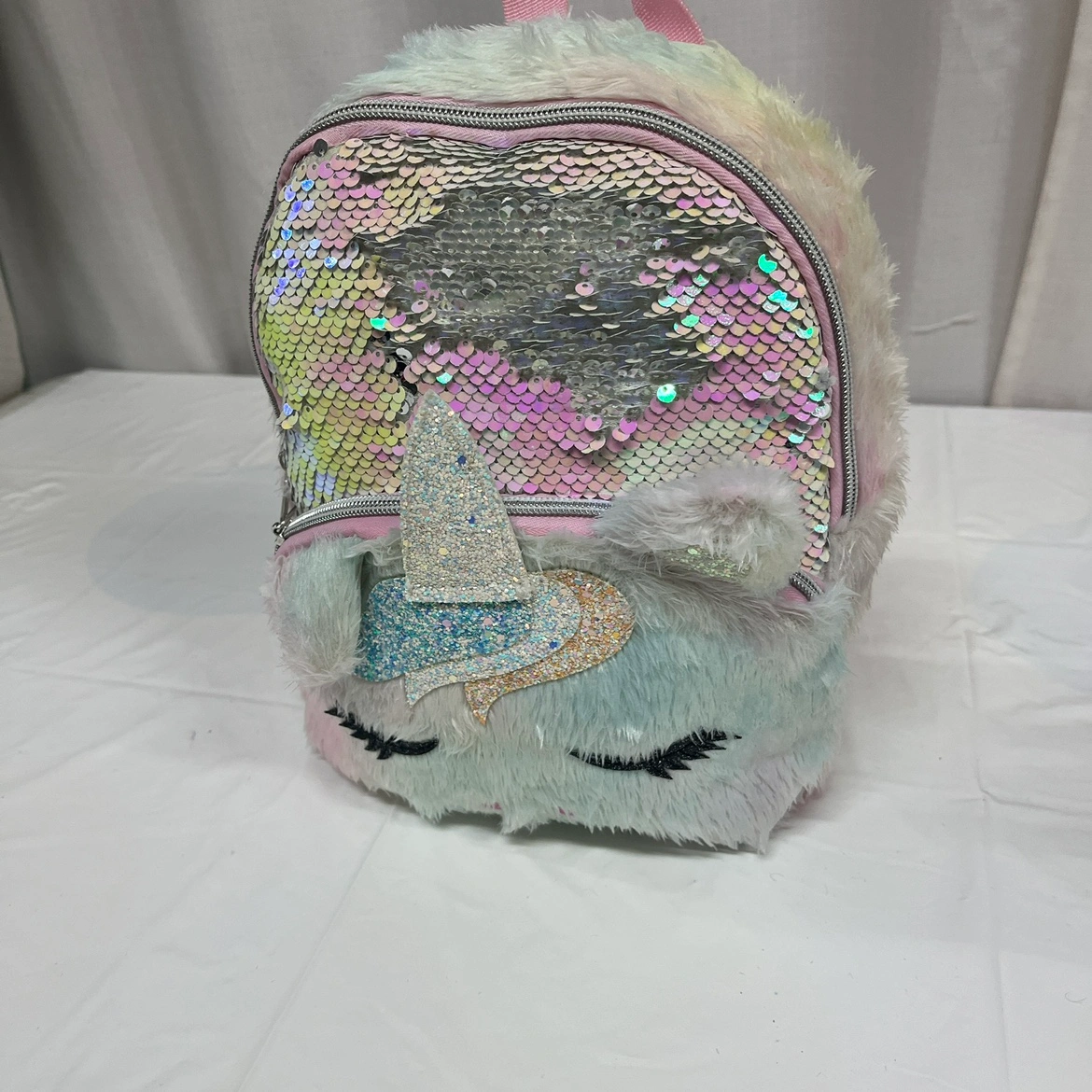 Small, pink and blue fuzzy backpack with sequins on the back. Perfect for a little girl. It has a zipper closure, two adjustable straps, and a small handle on the top.