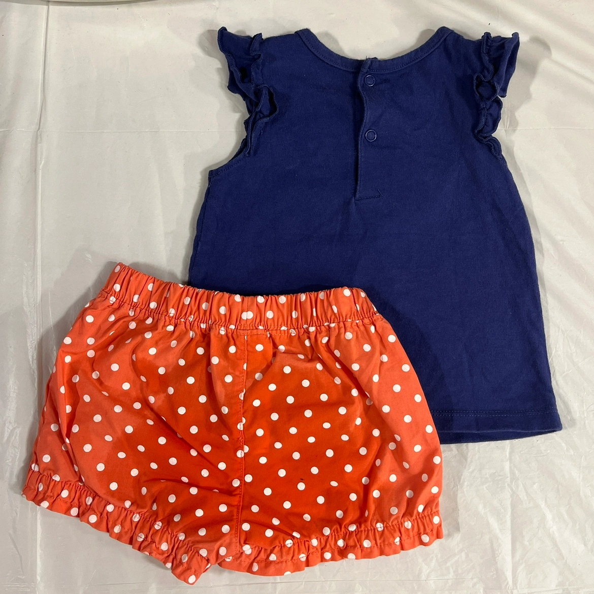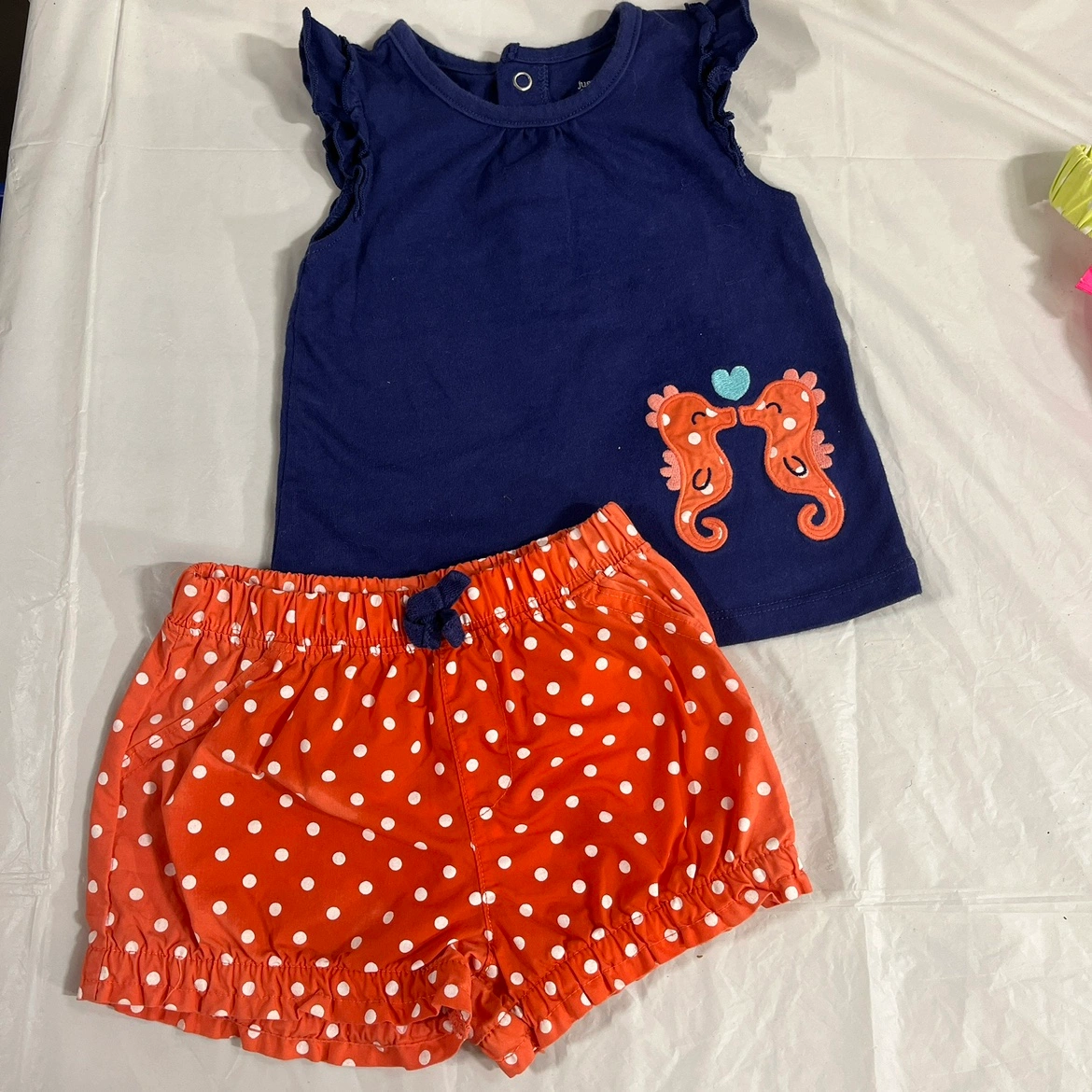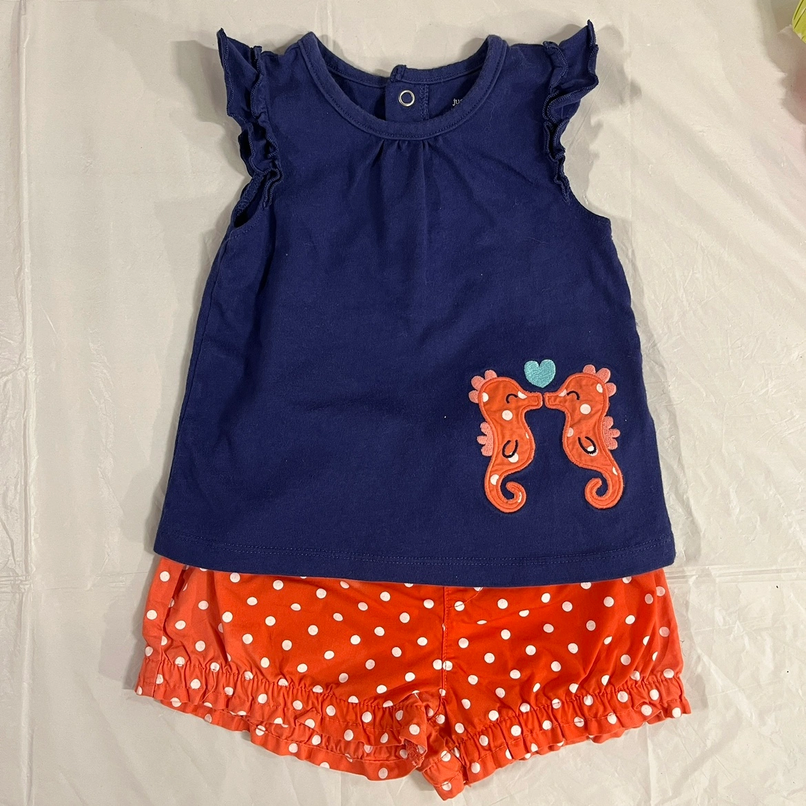This set includes a navy blue top with a seahorse design and white polka dot shorts.