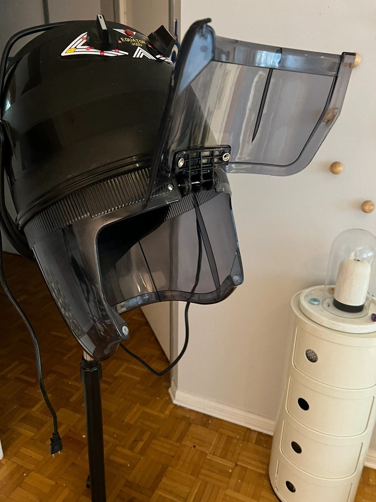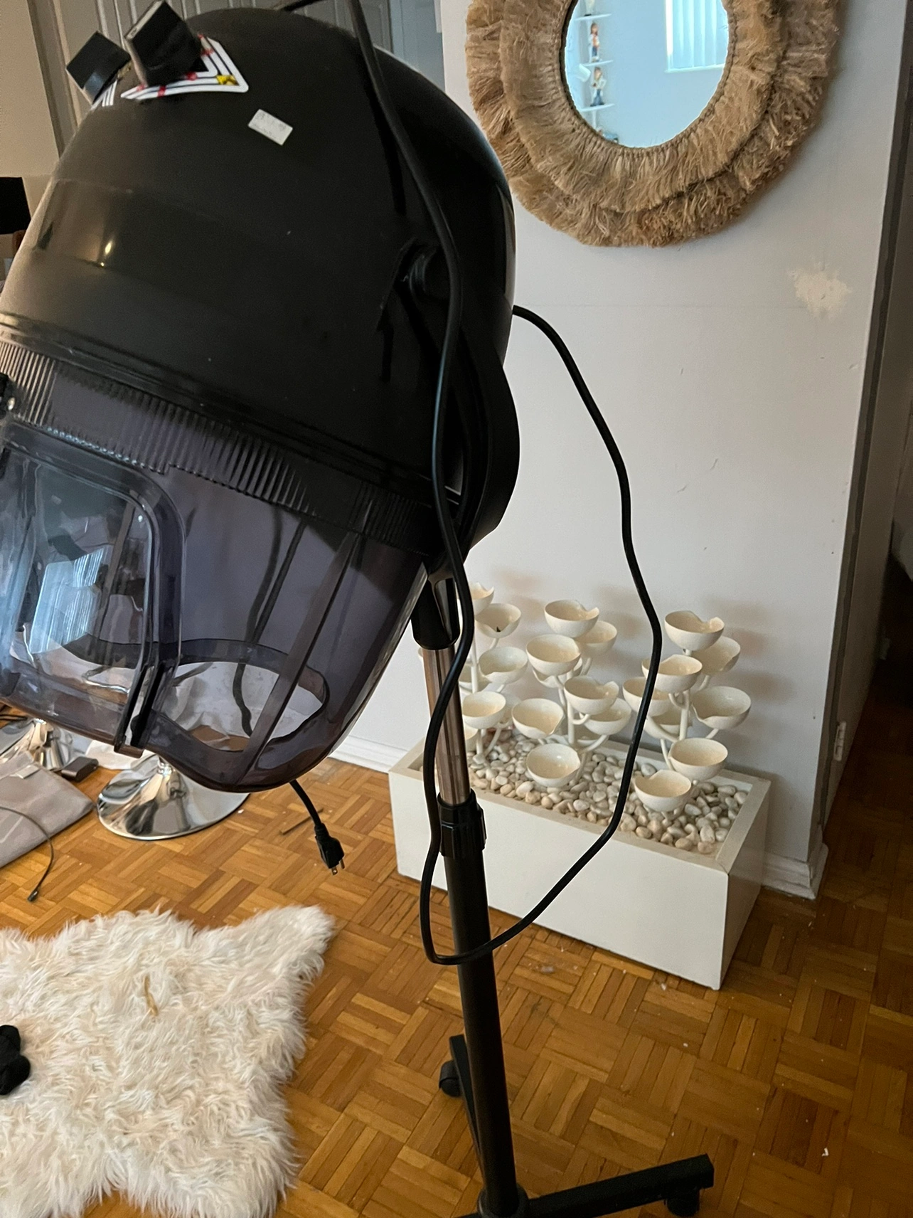 Used, comes with a stand, and features a clear plastic hood. Includes a cord. The hair dryer has different temperature settings.