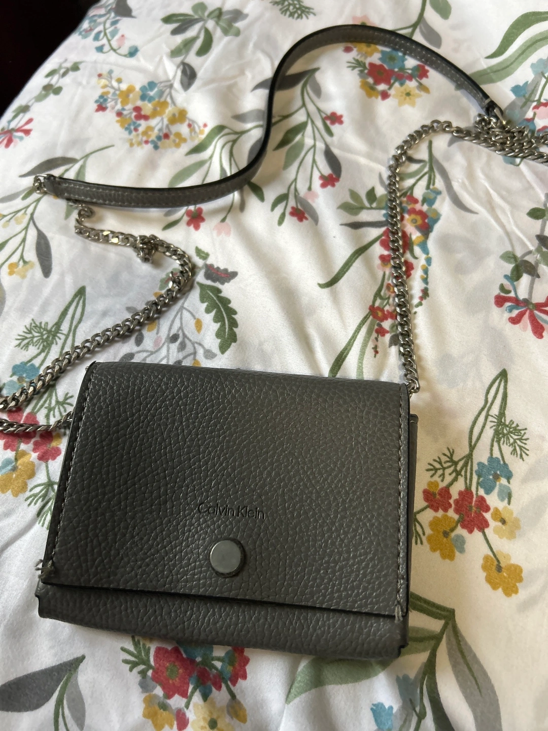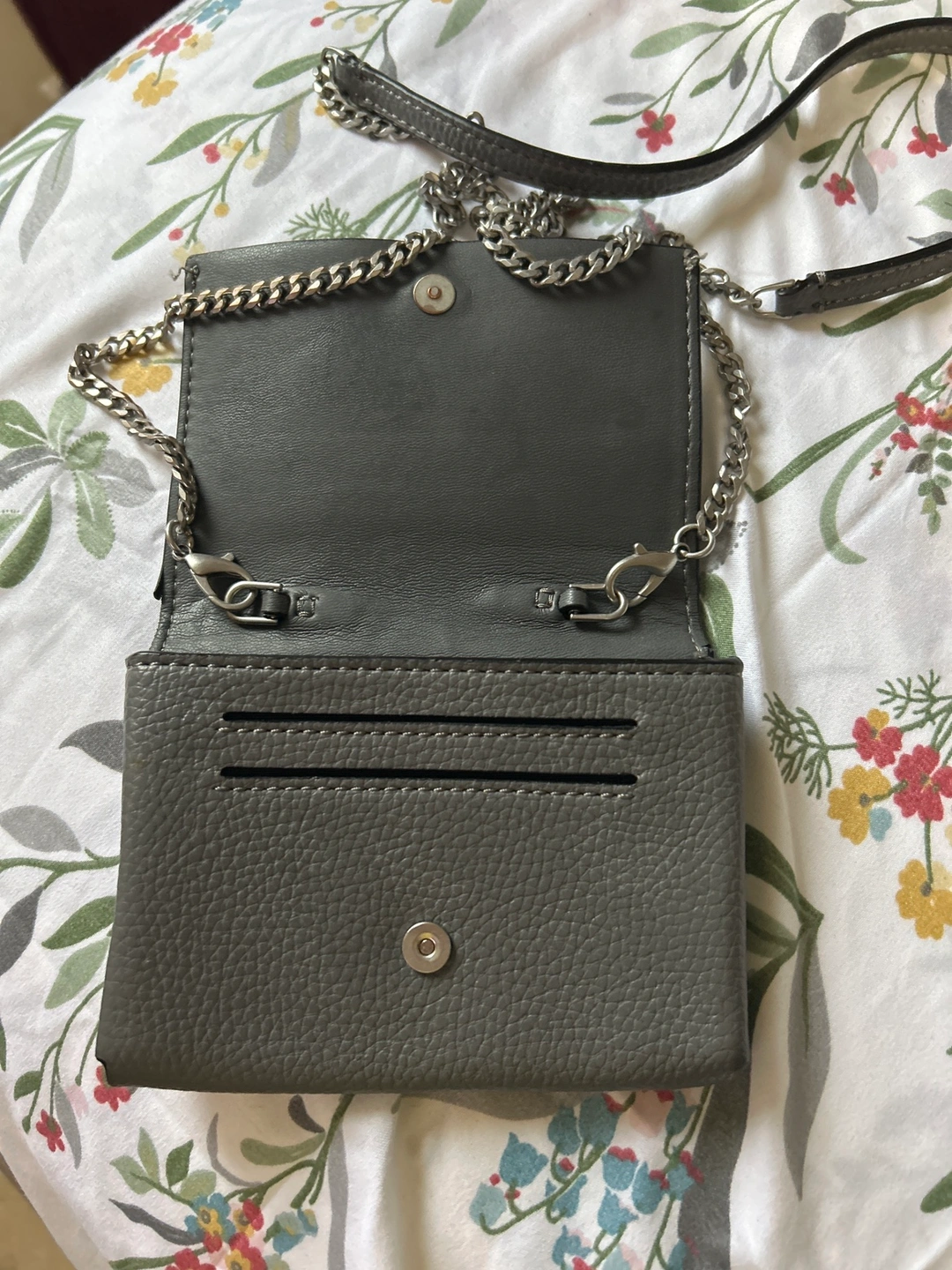 Small grey chain bag,strap is removable. It can be worn as a shoulder bag or a cross-body bag.