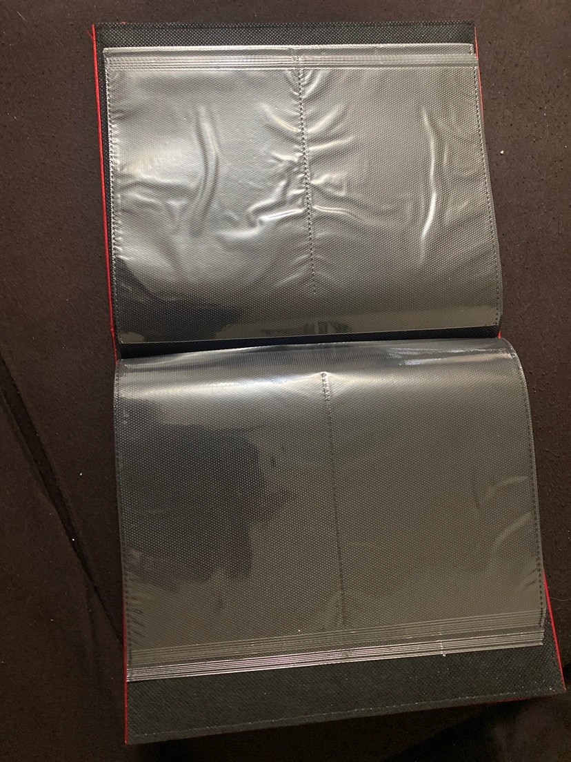 A red photo album with black interior pages and clear plastic sleeves.