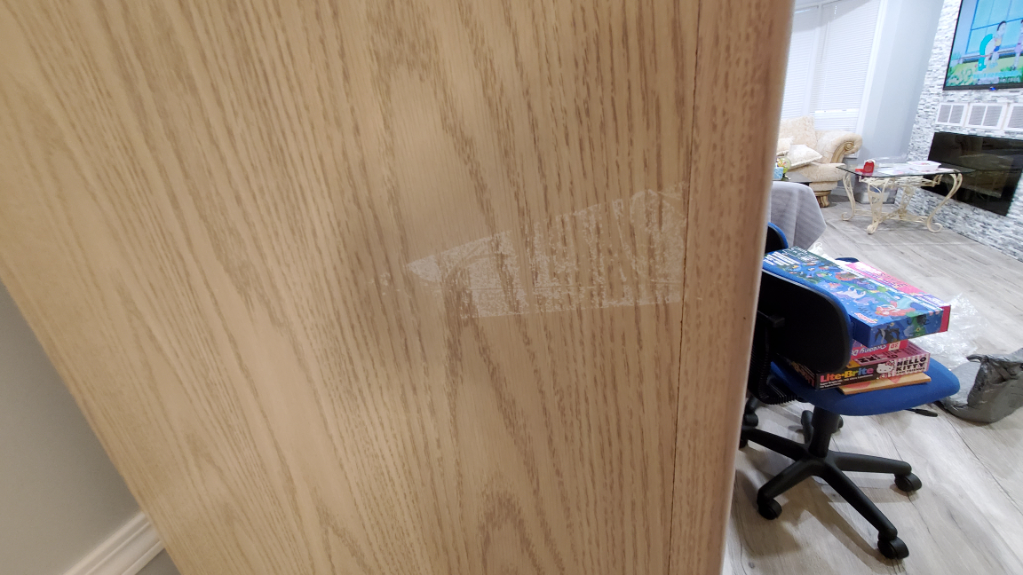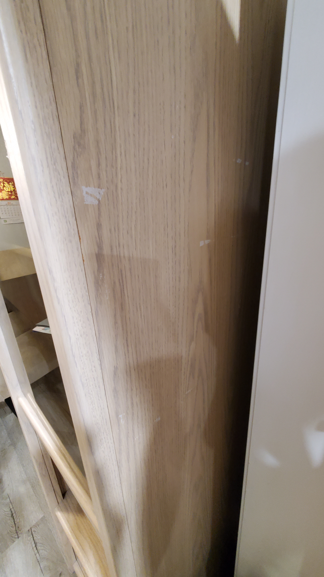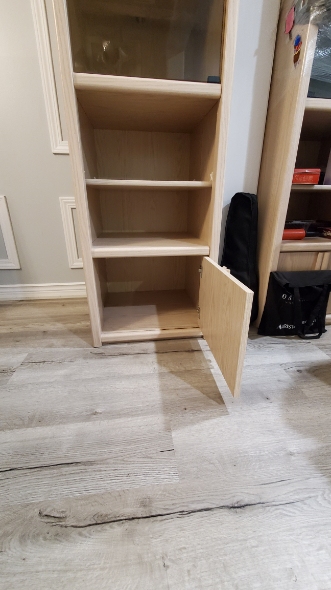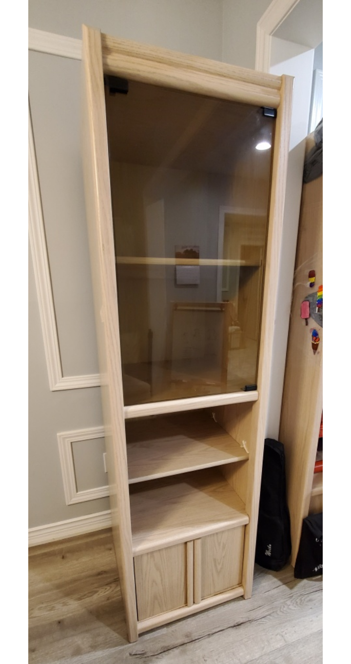 A tall bookcase with glass doors, two shelves, and a closed cupboard at the bottom. It is in good condition. The glass doors have a frosted look to them. There are some minor scratches on the wood.
