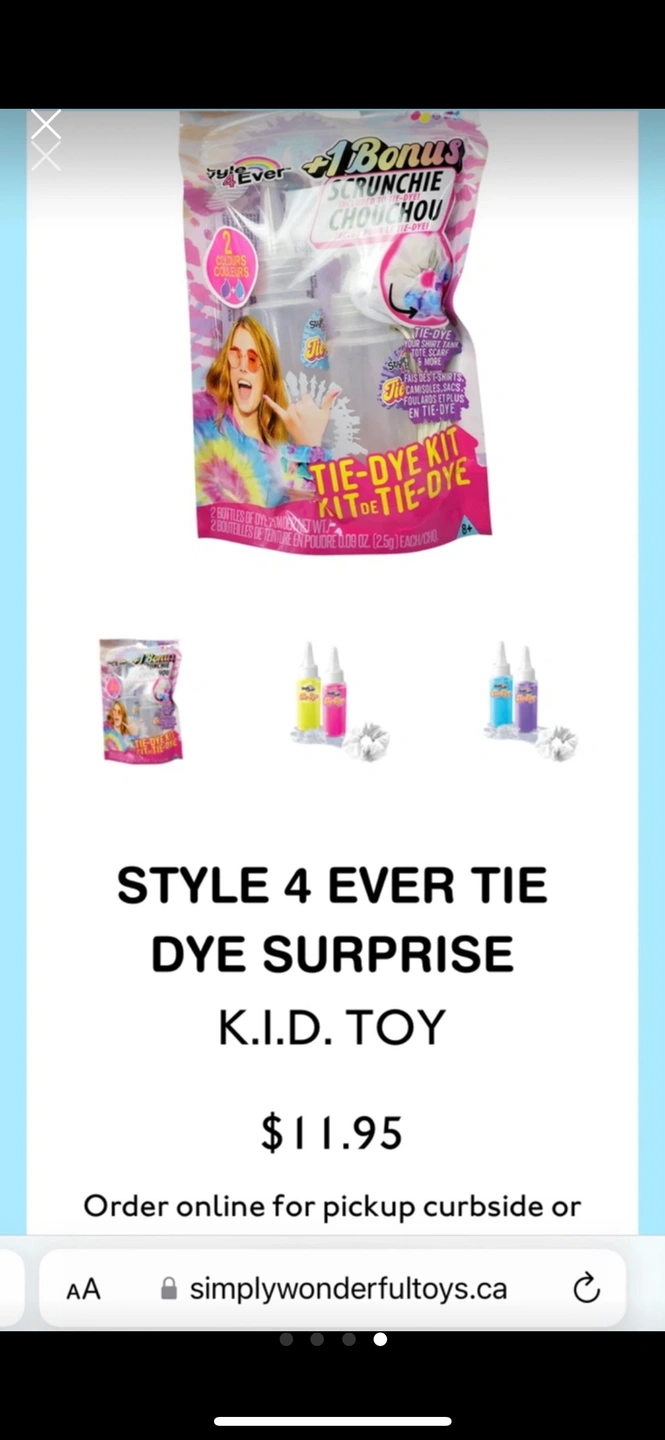 New. 10 dollars for both kits. Price is firm. Pick up only near Church and Carlton downtown. Great for gifts! Create your own awesome tie dye apparel and accessories! This kit comes with 2 colours of dye and elastics. There is a scrunchie included that can be used as your first project. Retail for 11.99+tax each!