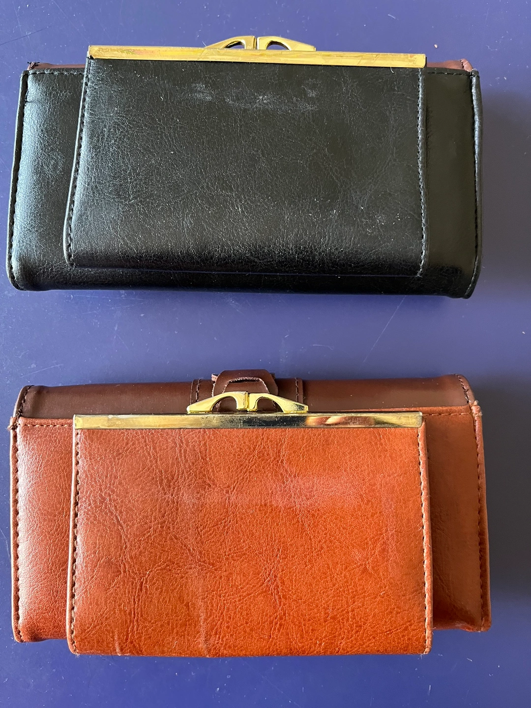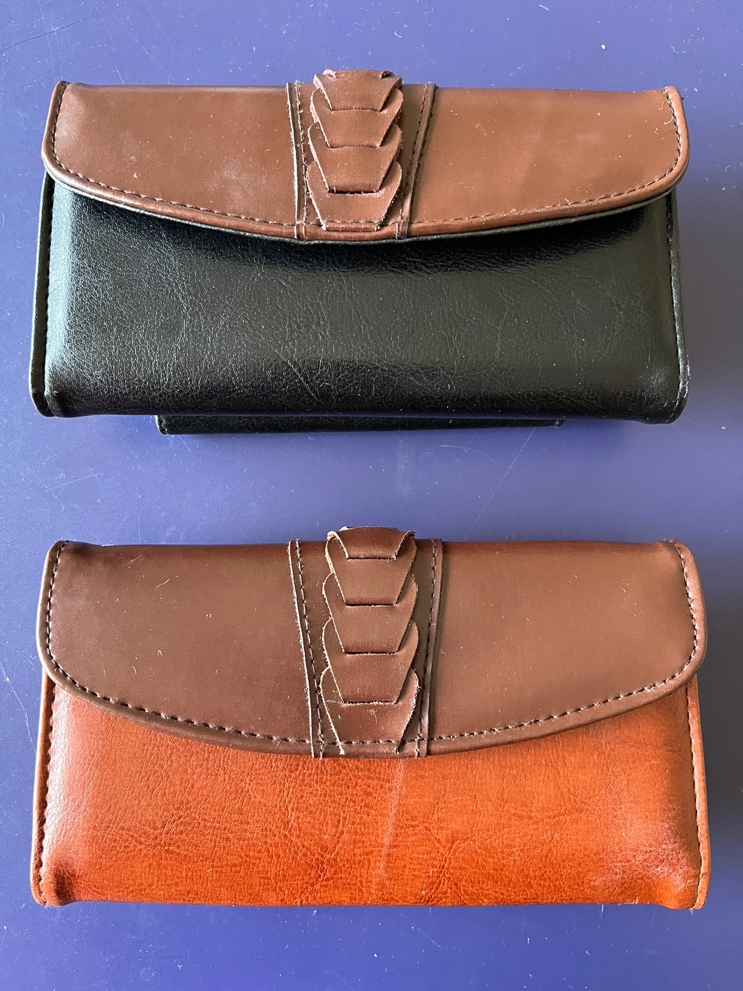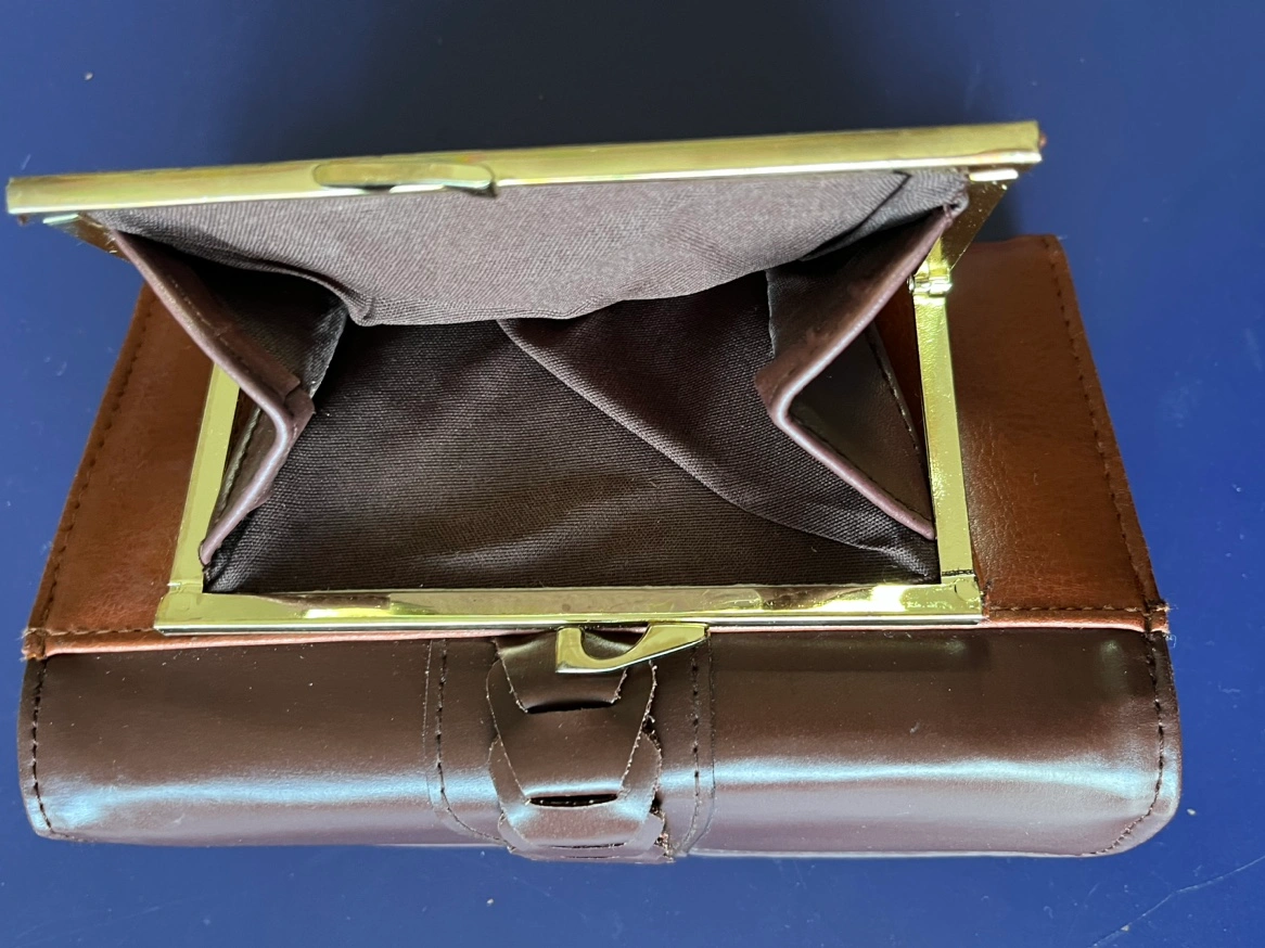 New women’s wallet in black colour. The wallet has a snap closure and a coin purse on the back. The inside has 6 card slots, 2 clear plastic slots, and a clear plastic window. It also has a section for a check book (see photos). No brand name. 7” L by 4” H.